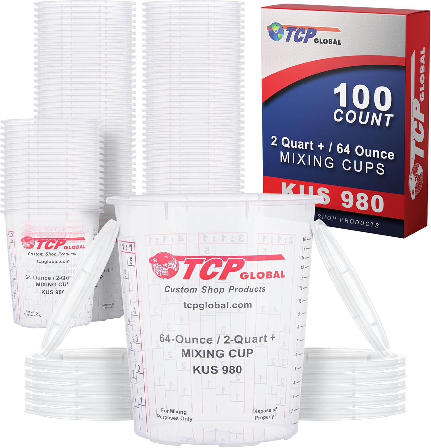 Custom Shop Paint Mixing Cups, 64-Ounce (Box of 100) - Plastic Measuring Cups for Liquids, Automotive Painting, Epoxy Resin, Acrylic Arts, Crafts, Disposable or Reusable, Graduated, Mixing Ratios