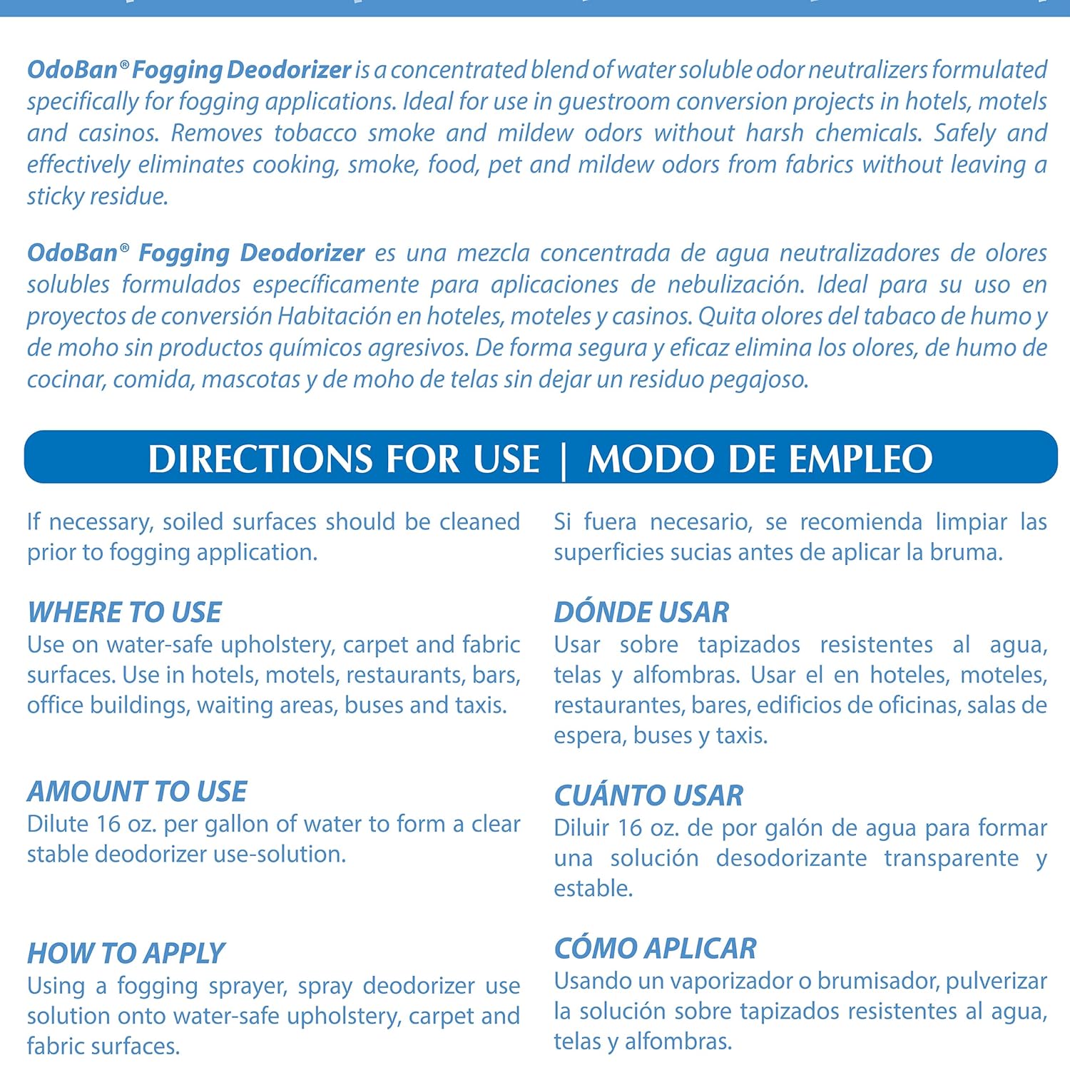- Directions for Use: Use as directed on label. Using a fogging sprayer, spray deodorizer use solution onto water-safe upholstery, carpet, and fabric surfaces. If necessary, soiled surfaces should be cleaned prior to fogging application.
