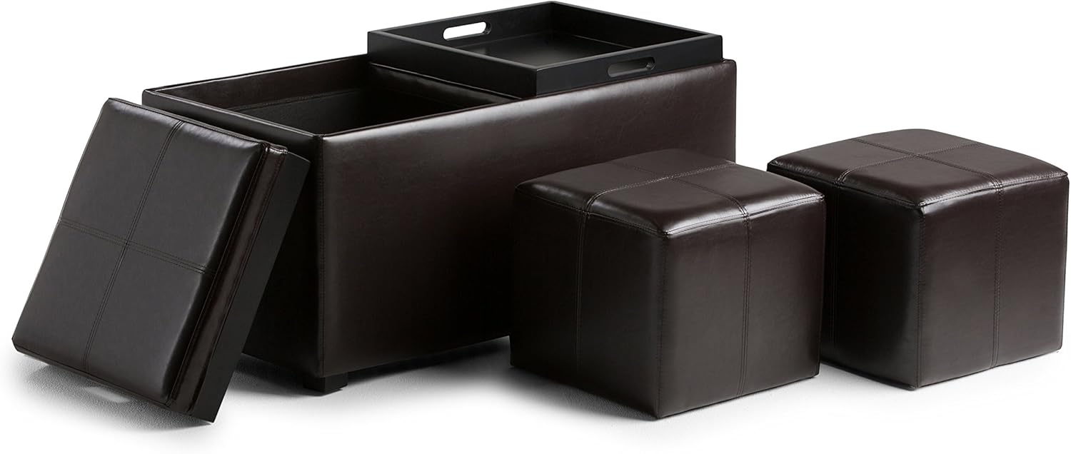 SIMPLIHOME Avalon 35 inch Wide Contemporary Rectangle 5 Pc Storage Ottoman in Tanners Brown Vegan Faux Leather, Assembled, for the Living Room, Entryway and Family Room