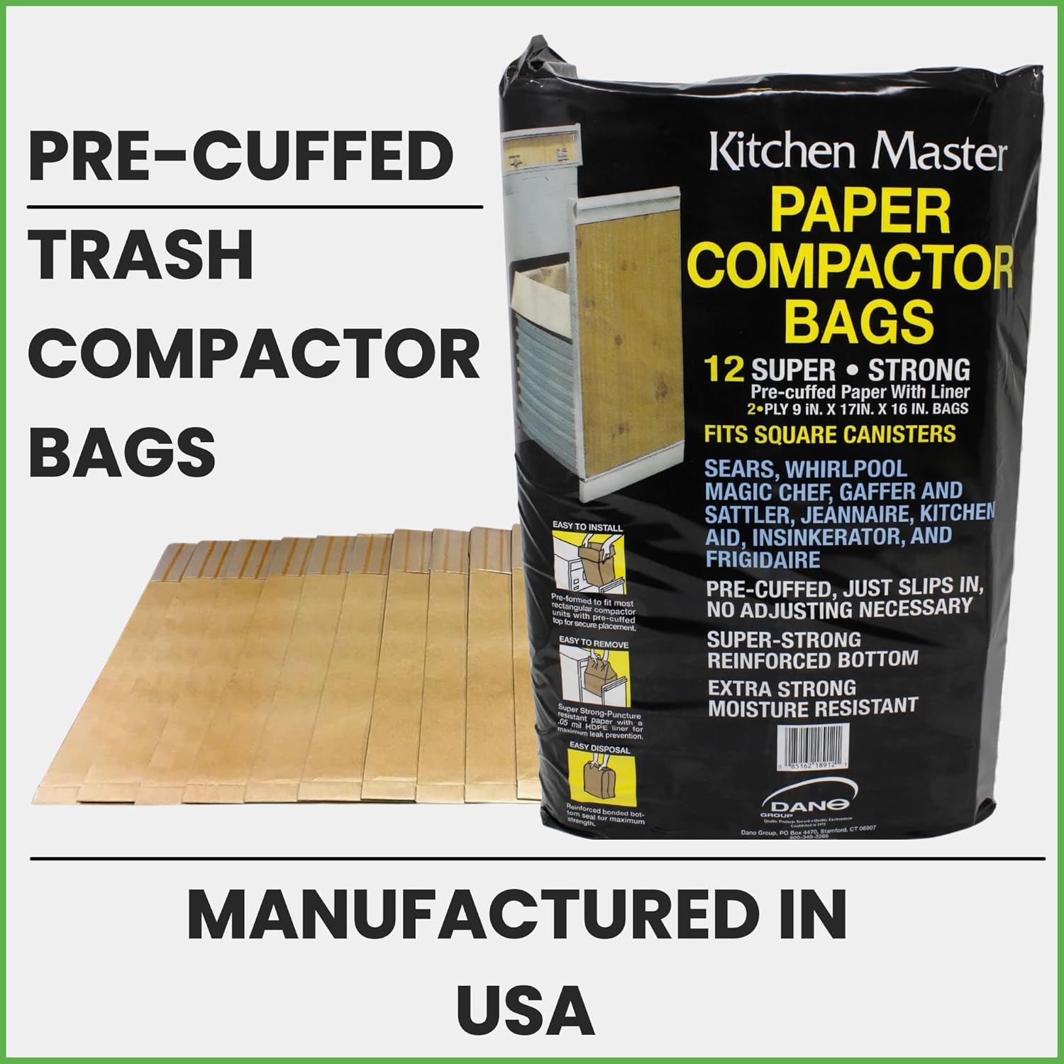 Kitchen Master Super Strong Compactor Bags (12 Pack) | Precuffed, Garbage Compactor Bags, Kitchen Liner, Paper Trash Bin Press, Kitchen Essential, Paper Garbage Press Liner