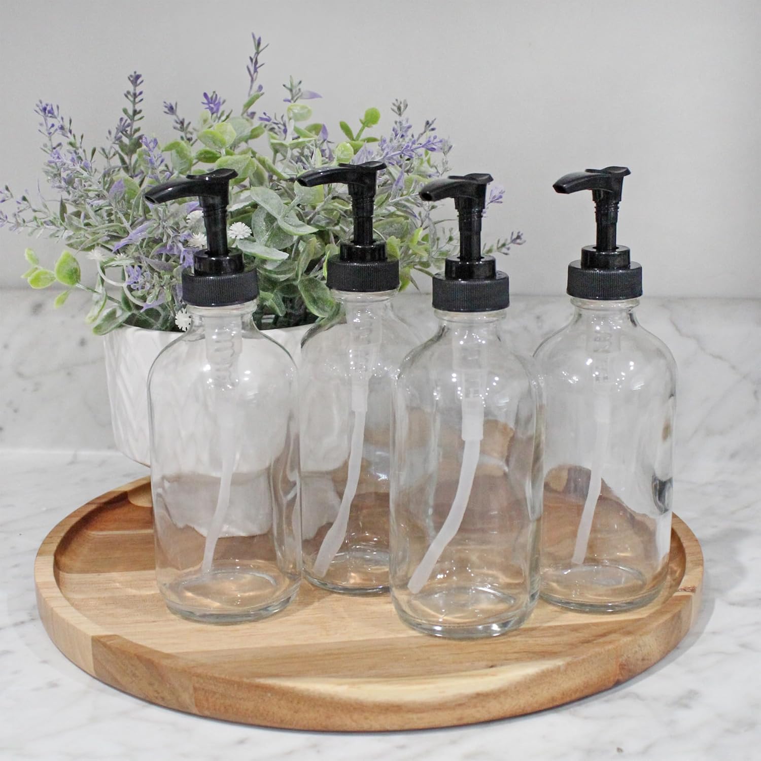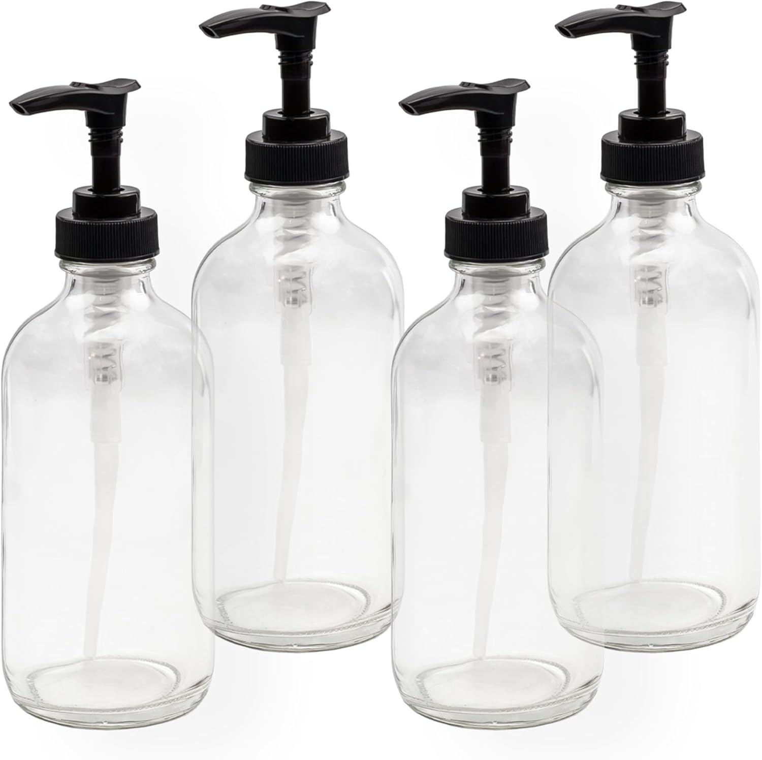 - VALUE 4-PACK: Receive four empty 8oz clear glass Boston round bottles with BPA-free black plastic pump tops