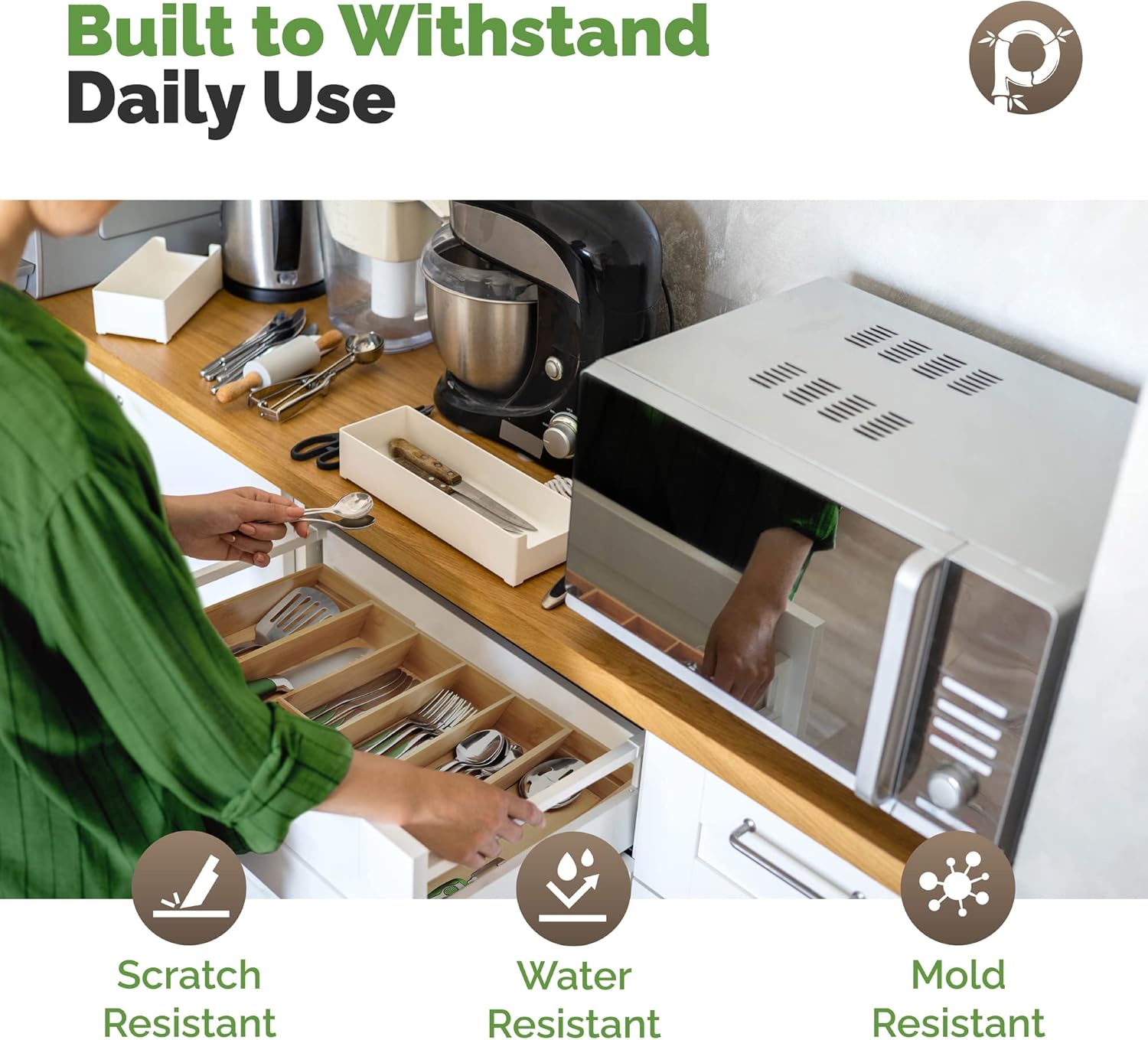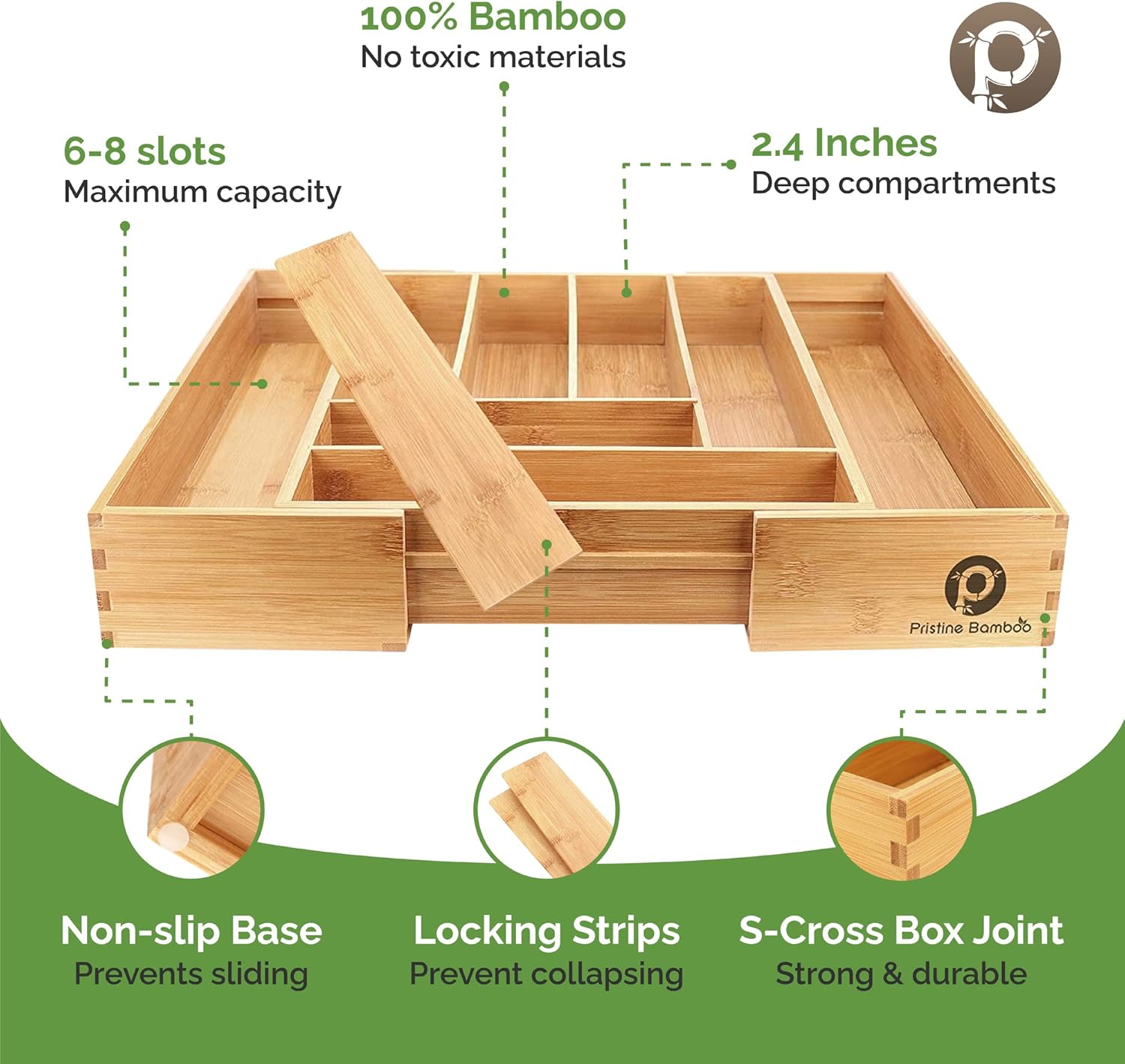 - ADJUSTABLE WIDTH & LOCKING MECHANISM: Innovative expandable sides lock in place when fully expanded, so you can choose between 6, 7, or 8 compartments to accommodate your desk supplies or various kitchen utensils of different sizes. Much better than ordinary bamboo drawer dividers. Expands from 12.5 inches to 19.3 inches. (Please measure your drawer carefully before ordering to avoid disappointment.)