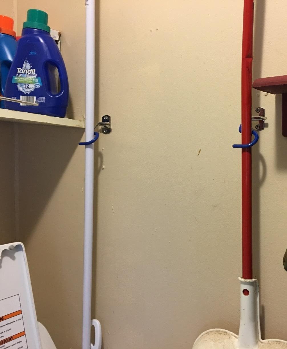 - Space Saver - Whether whenever you needed a mop or broom you had to go on the search for where it was left... the closet or garage? Next to the fridge? In the laundry room? These hooks are the exact solution for your needs. It's a space saver and a organizers dream!! No more clutter!! Lift to remove a broom or mop. And simply press back down, to put it back in place.