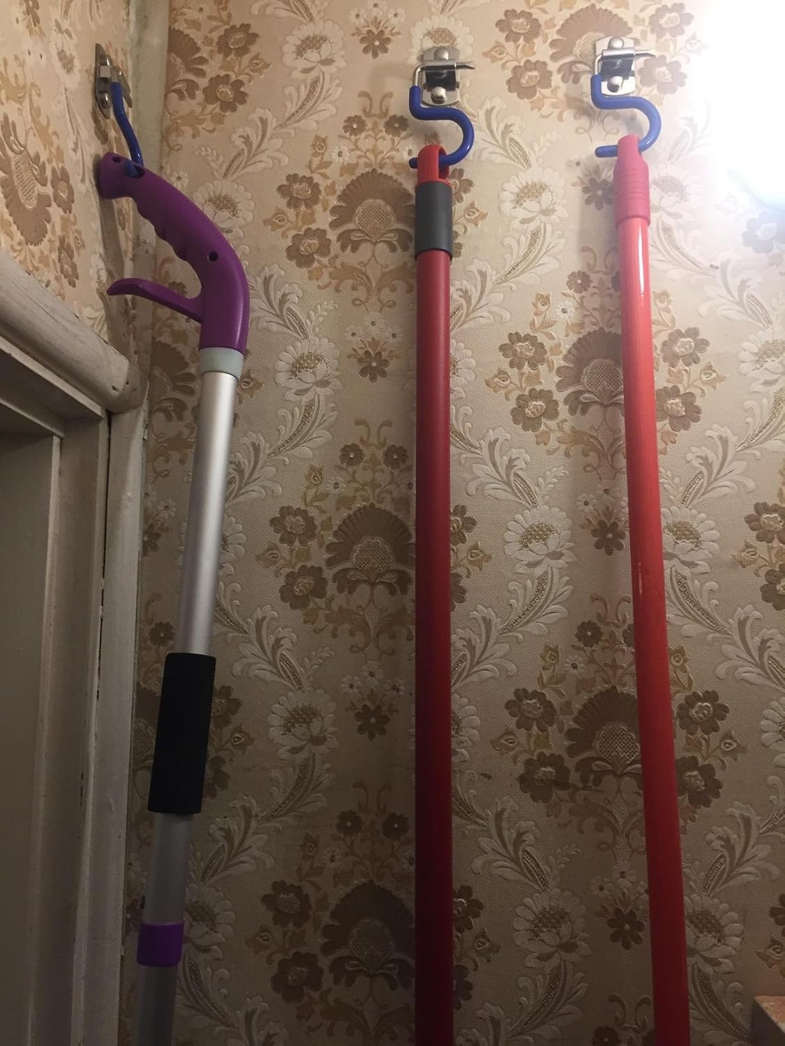 - Easy to install, looks awesome, and the hooks that holds your heavy brooms. Nicely to a variety of handle sizes but holds firm. The hooks are fairly sturdy and fold out of the way when not being used. You can hang a broom, swifter mop and swifter duster and other long-handled tools.
