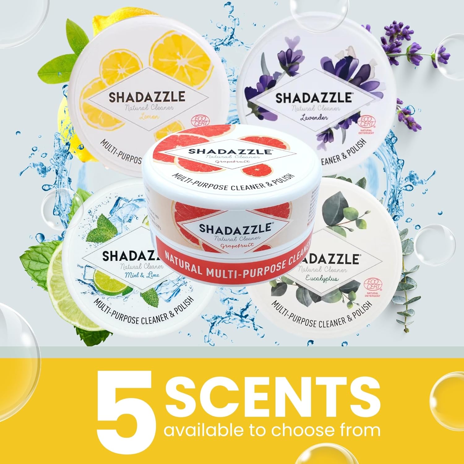 - NATURAL ALL PURPOSE CLEANER : Shadazzle is a multi purpose cleaner that works on any washable surface. It is made with natural ingredients only : clay, vegetal oil, vegetal glycerin, lemon fragrance. No harmful chemicals or phosphates