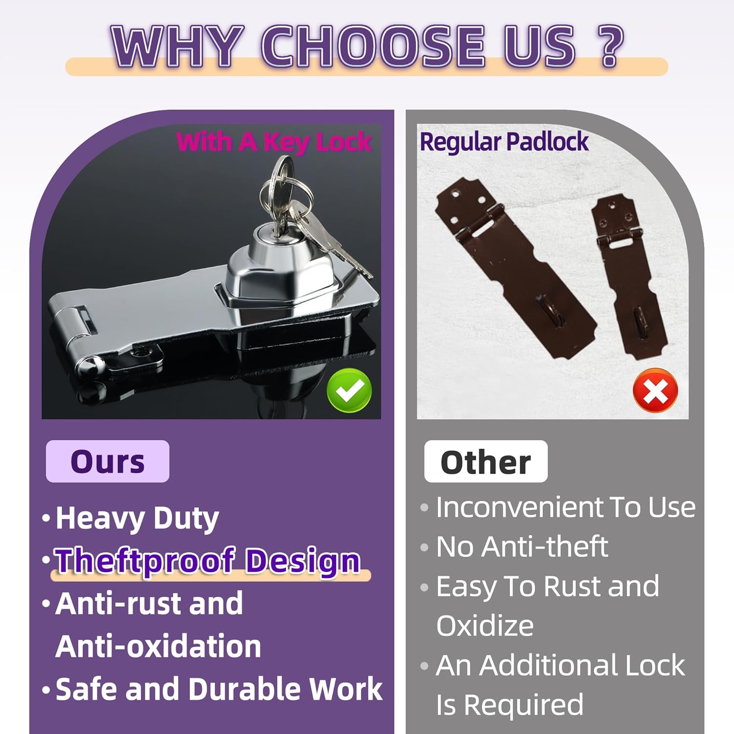 - 【Wide Applications】The locking hasp is suitable for installation in the place where you need to lock protect your house, property, and personal privacy. Such as all kinds of door, window, cabinet, drawer, furniture, pet cage, closets, cupboards, storage containers, sheds, storage bins, garage doors, tool boxes,sliding doors, wardrobes, fence,and etc.