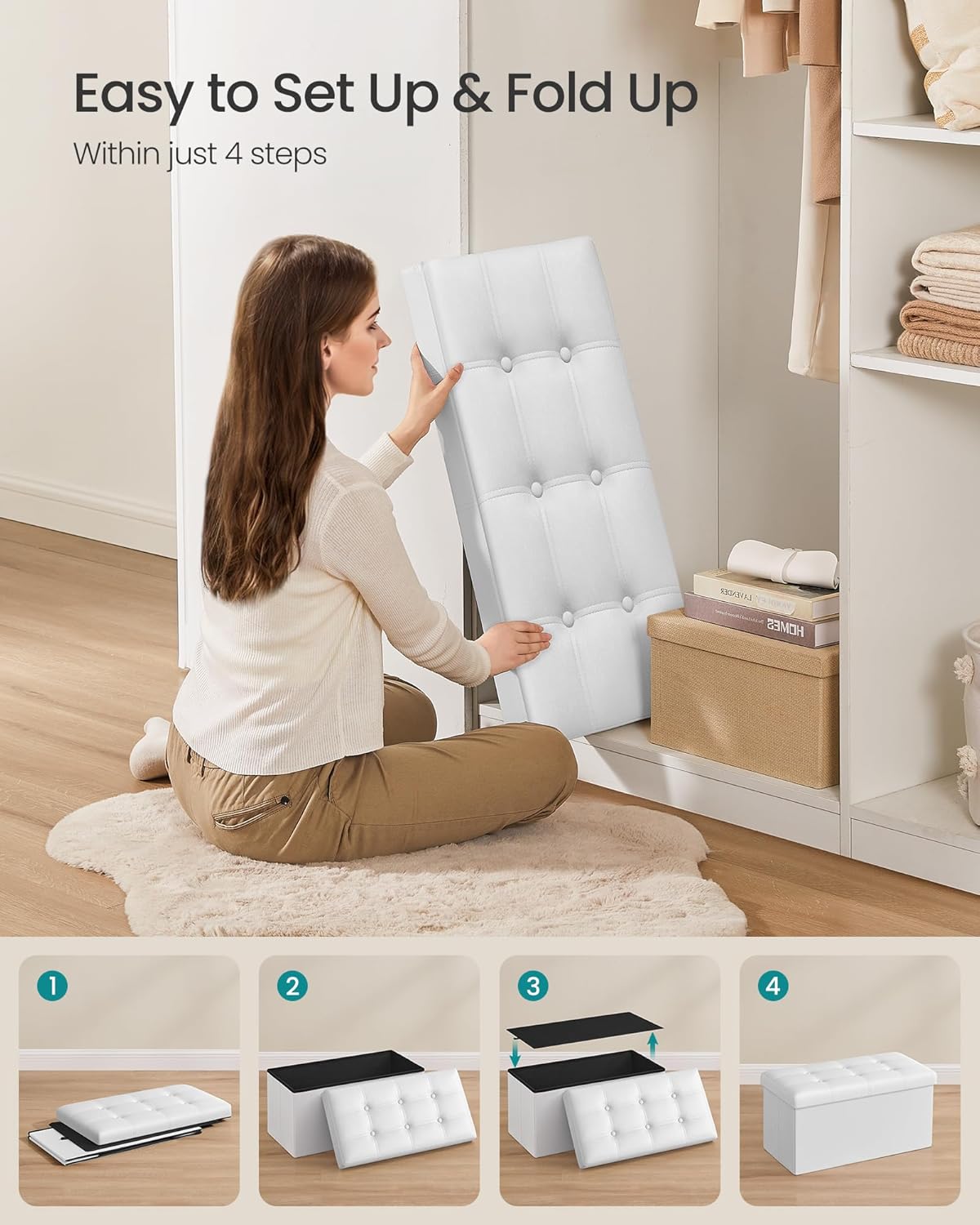 SONGMICS MAZIE Collection - 30 Inches Folding Storage Ottoman Bench, Ottoman with Storage, Foot Rest Stool, Load 660 lb, for Living Room, Synthetic Leather, White ULSF106
