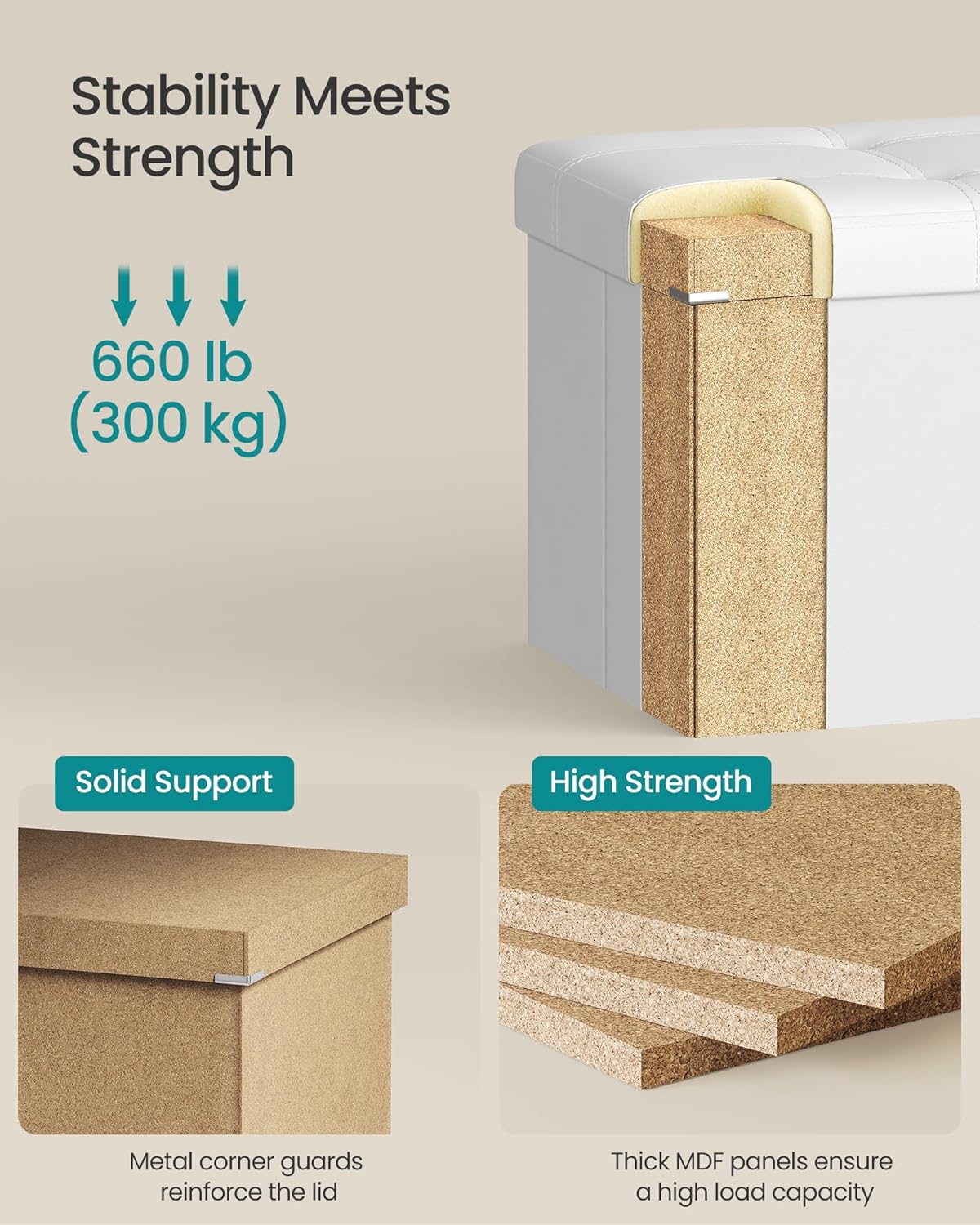 - ăGREAT STRENGTHăBuilt with thick MDF panels and reinforced with metal corner guards on the lid, this storage chest is strong enough to hold up to 660 lb (300 kg), so you can sit on it with your mind at ease