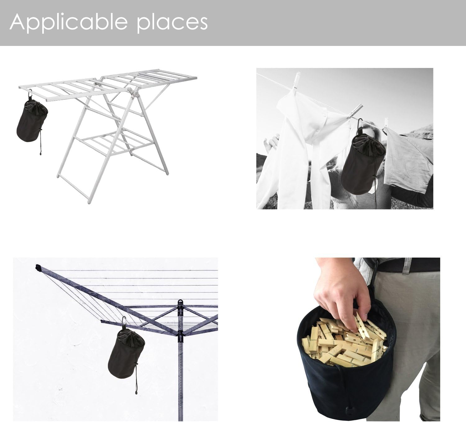 - Function feature : the clothespins bags,easy to attach to the clothes line,rotary dryer,drying rack and belt.,