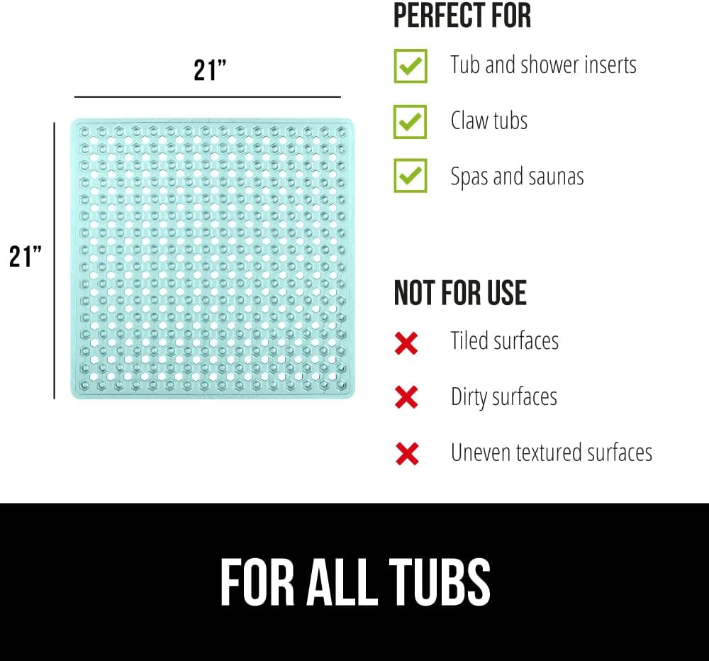 - OVERSIZED AND MACHINE WASHABLE: the shower mat is so easy to clean, simply machine wash and air dry; you can easily air dry the shower mat by hanging it over the side of the tub; square mat is conveniently sized 21” x 21” providing excellent coverage for standing showers
