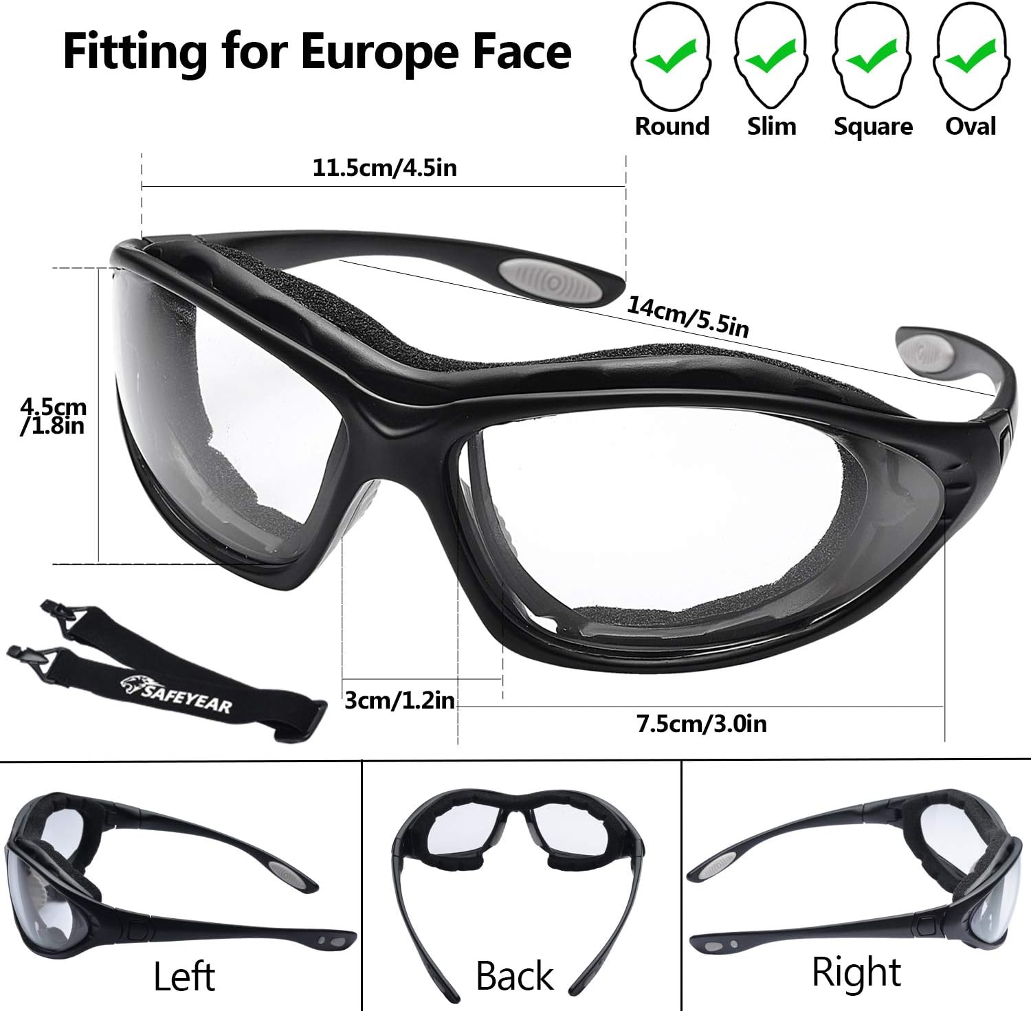 - đ„ăDESIGNED TO BE PROTECTIVE AND BUILT TO LASTă: SAFEYEAR Anti fog safety goggle over glasses keep your eyes safe from direct and peripheral threats with a strong and durable polycarbonate wraparound construction. The adjustable elastic band helps you get the fit just right. Also protects eyes from 90-99% of harmful UV radiation, Ligth Weight Adult Work Glasses 100% from tear Off, protect your eye far from sunshine harmness