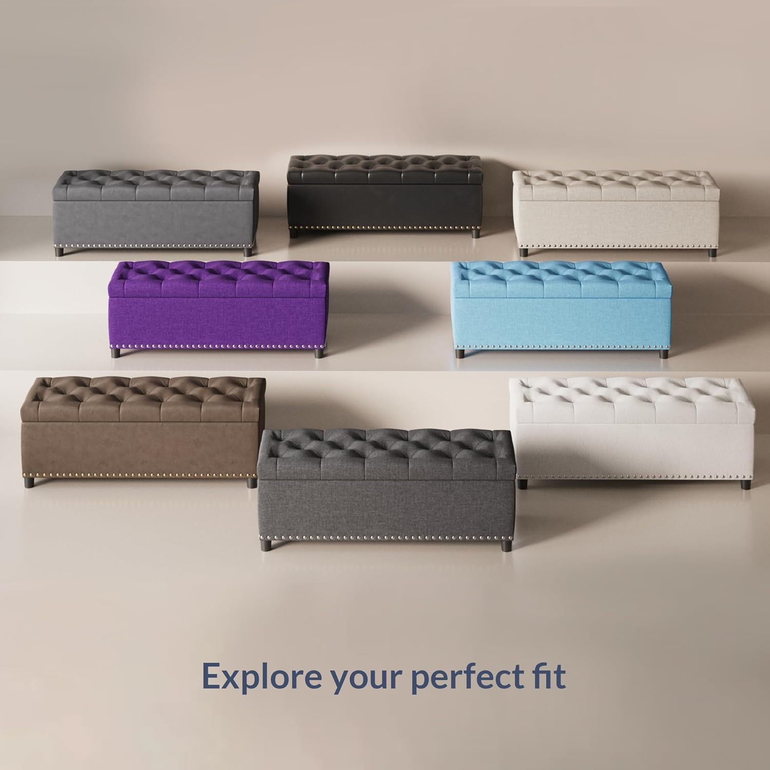 - [UNIQUE LIVING ROOM OTTOMAN] Clean-lined rectangular ottoman with a sleek frame boasts a dapper design that blends classic modern design with a luxurious appeal. Covered with faux leather upholstery with tufted button detailing at the top for an upscale look. A row of gleaming nail head trims at the bottom adds glam accents. Safety hinges ensure the lid remains open until you put away all items, preventing slamming.