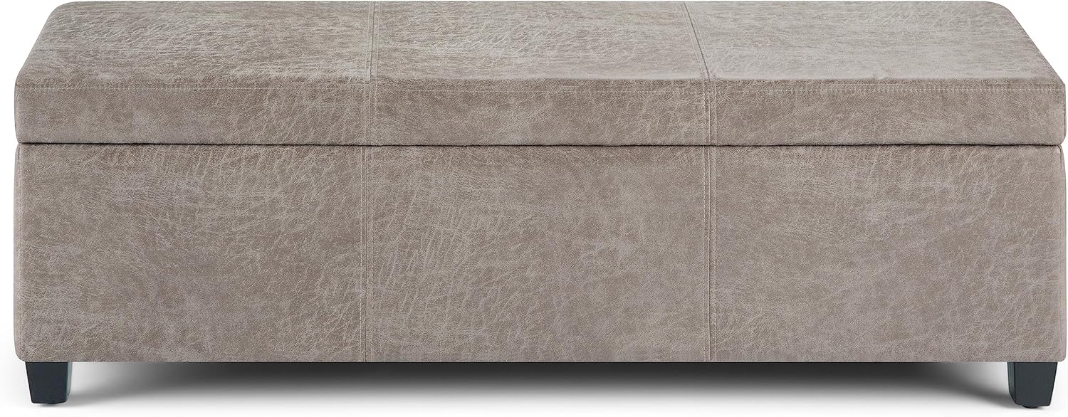 SIMPLIHOME Avalon 48 inch Wide Contemporary Rectangle Storage Ottoman Bench in Distressed Grey Taupe Vegan Faux Leather, Assembled, for the Living Room, Entryway and Family Room