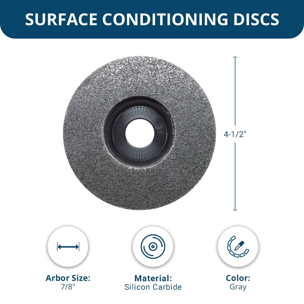 - Benchmark Abrasives 4-1/2" diameter with 7/8" arbor surface preparation discs are color-coded to identify the grit quickly. Premium silicon carbide grains effectively clean, blend, and finish stainless steel and other metals.