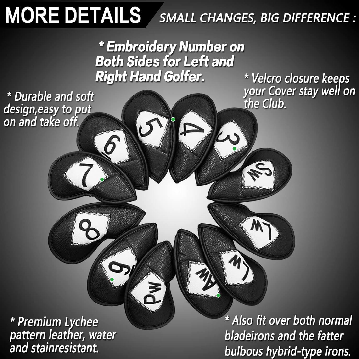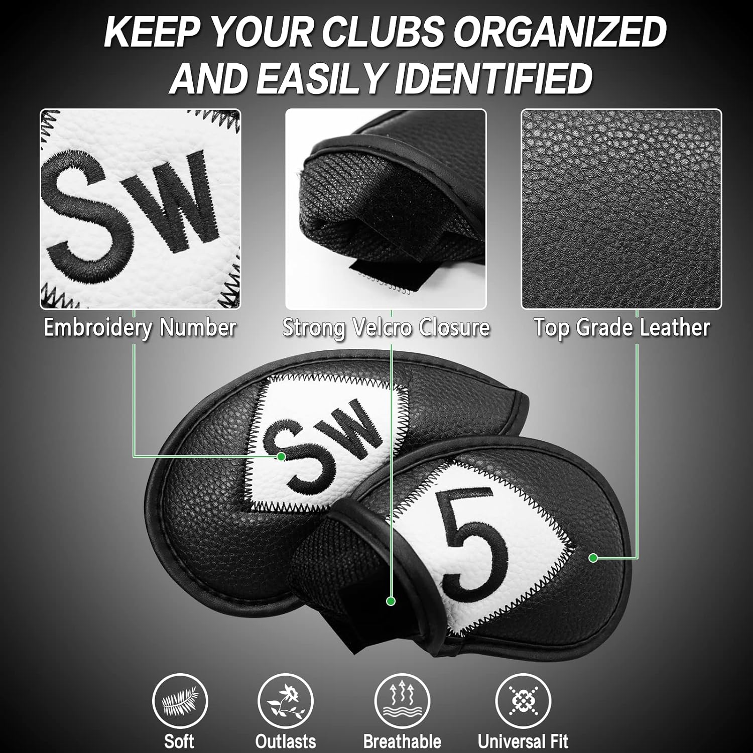 - Keep Your Irons Safety Anywhere: These Premium Golf Head Covers are a Must-have for Every Golfer who Values Protection and Style. Made from High-quality Synthetic Leather, They’re Water-resistant and Provide a Snug Club Fit to Shield Your Irons from Scratches, Dings, and Wear. Designed for Both Daily Play and Travel Convenience, They Add Sleek Aesthetic Appeal to Your Golf Bag Organization.