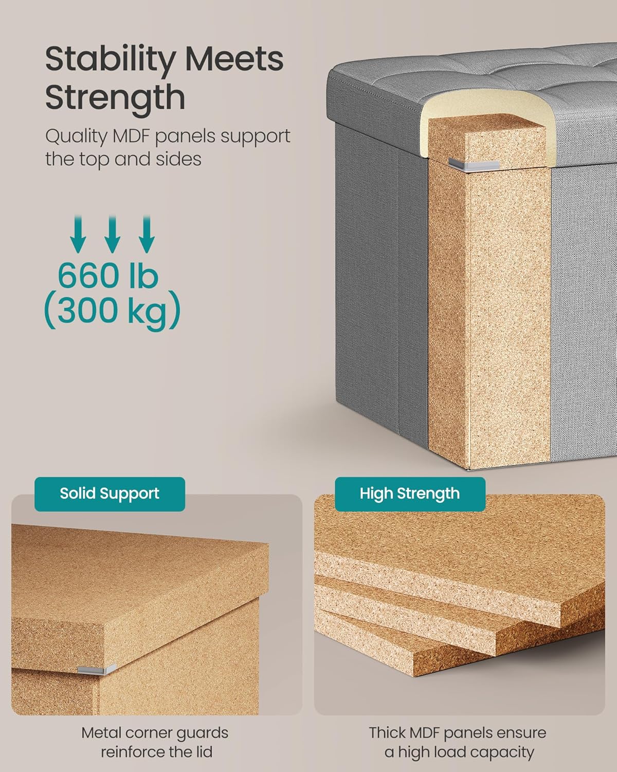 - ăSTURDY AND DURABLEăBuilt with premium MDF panels and reinforced with metal corner guards on the lid, this ottoman is strong enough to support up to 660 lb (300 kg), making it a reliable seating or storage solution that will stand the test of time