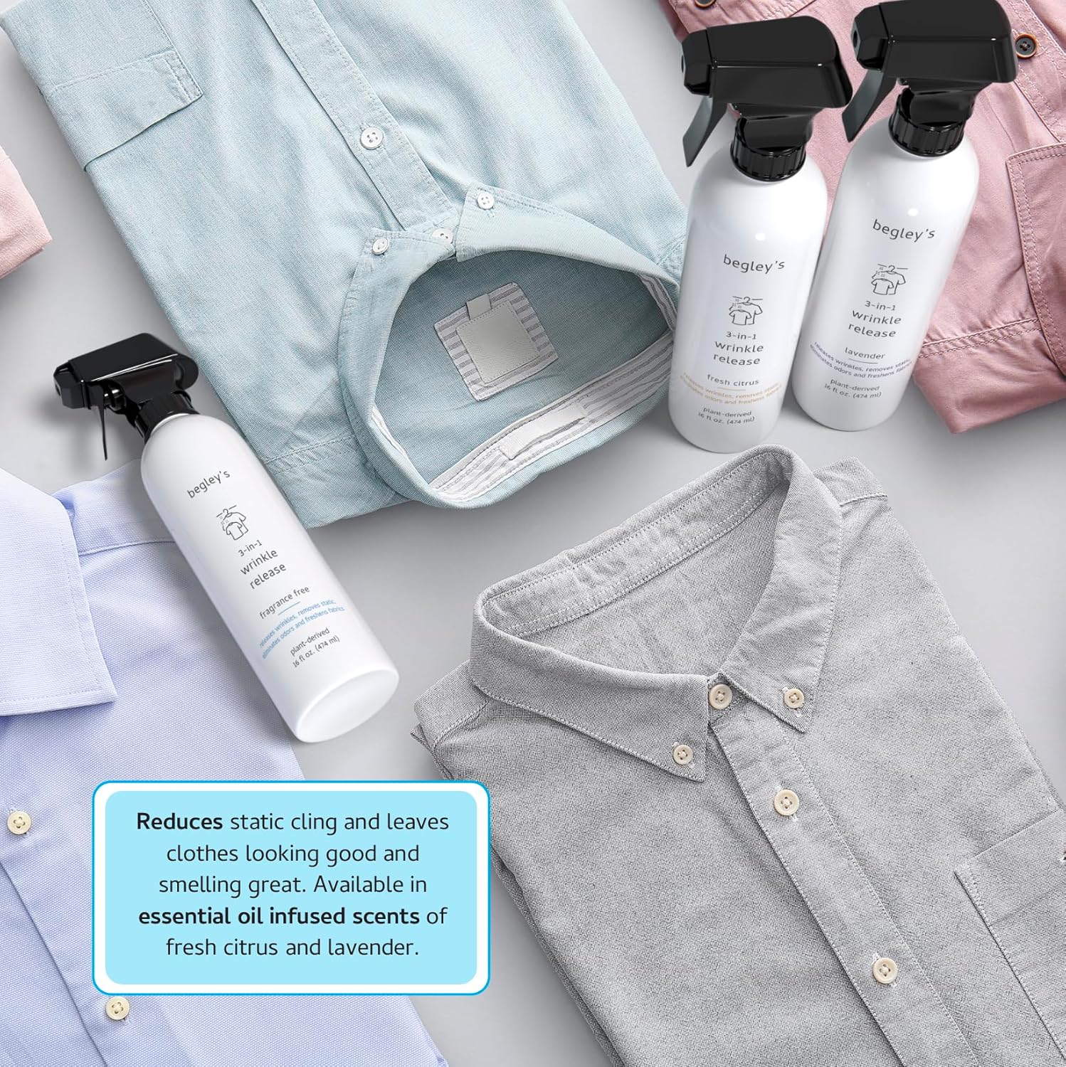 Begley's 3-in-1 Wrinkle Remover, Quick Fix Wrinkle Release, Static Cling Remover, Odor Eliminator and Fabric Refresher Spray - USDA Certified Biobased - Citrus, 16 oz, 2 Pack