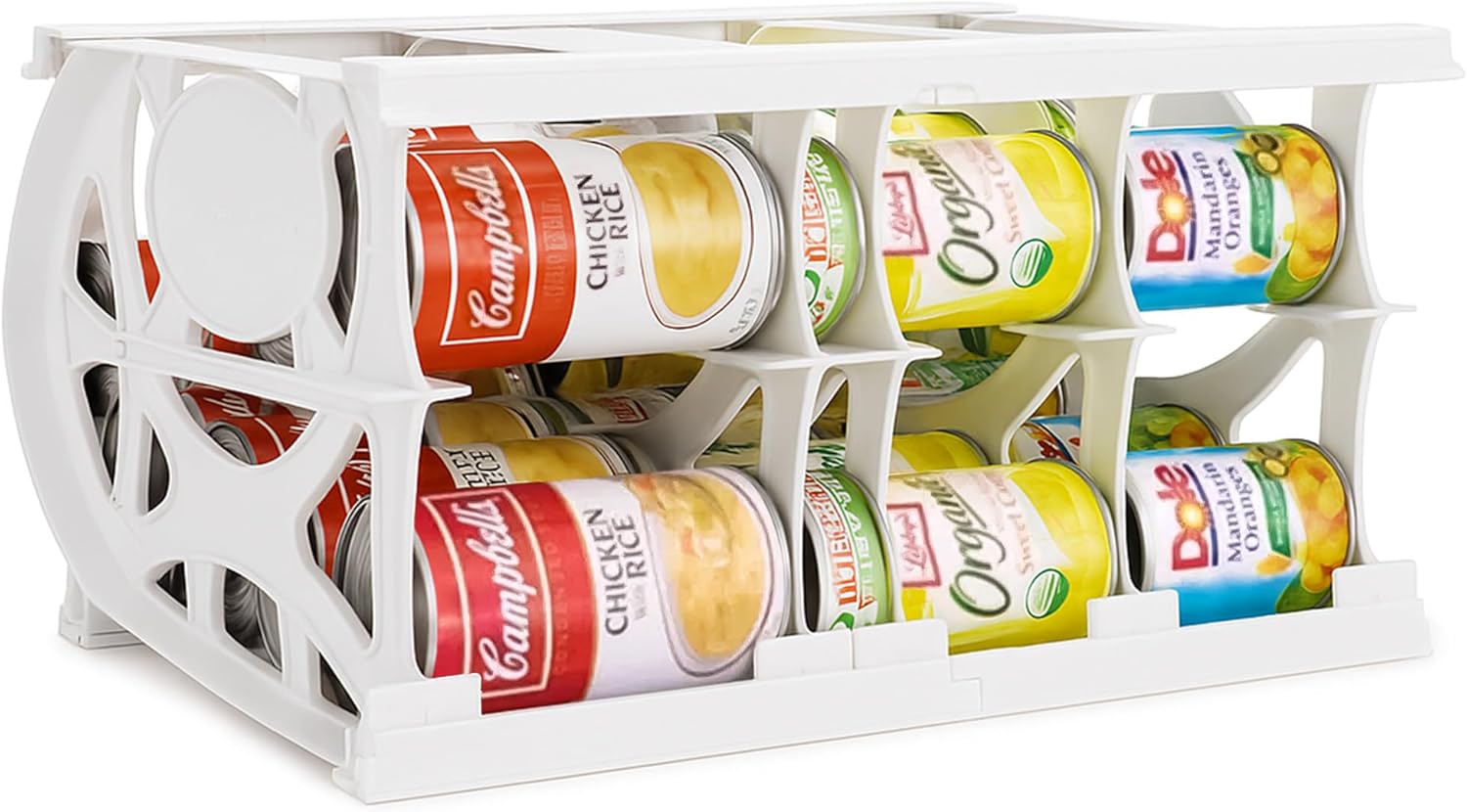 - GRAB & GO WITH SMART ROTATION - Our patented FIFO (First-in, First-out) rotating system ensures your oldest cans are used first, keeping your pantry fresh and organized. Every time you grab a can, the next one rolls forward, so nothing gets lost or forgotten in the back.