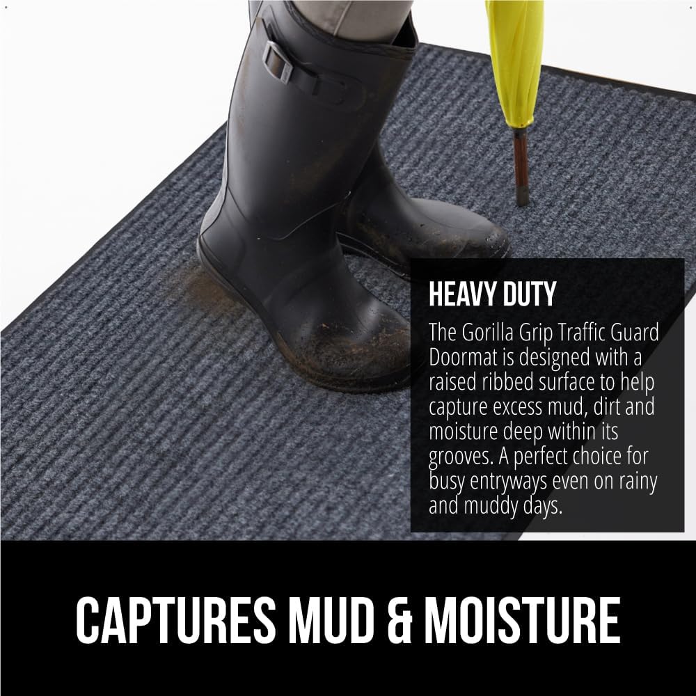 - BUILT TOUGH FOR HIGH TRAFFIC: the Gorilla Grip Traffic Guard doormat is ultra strong and built tough to withstand high foot traffic; constructed with a high quality textured PVC backing and raised fabric topside to help scrape off dirt and debris; thick and plush topside is gentle on bare feet, but durable for boots