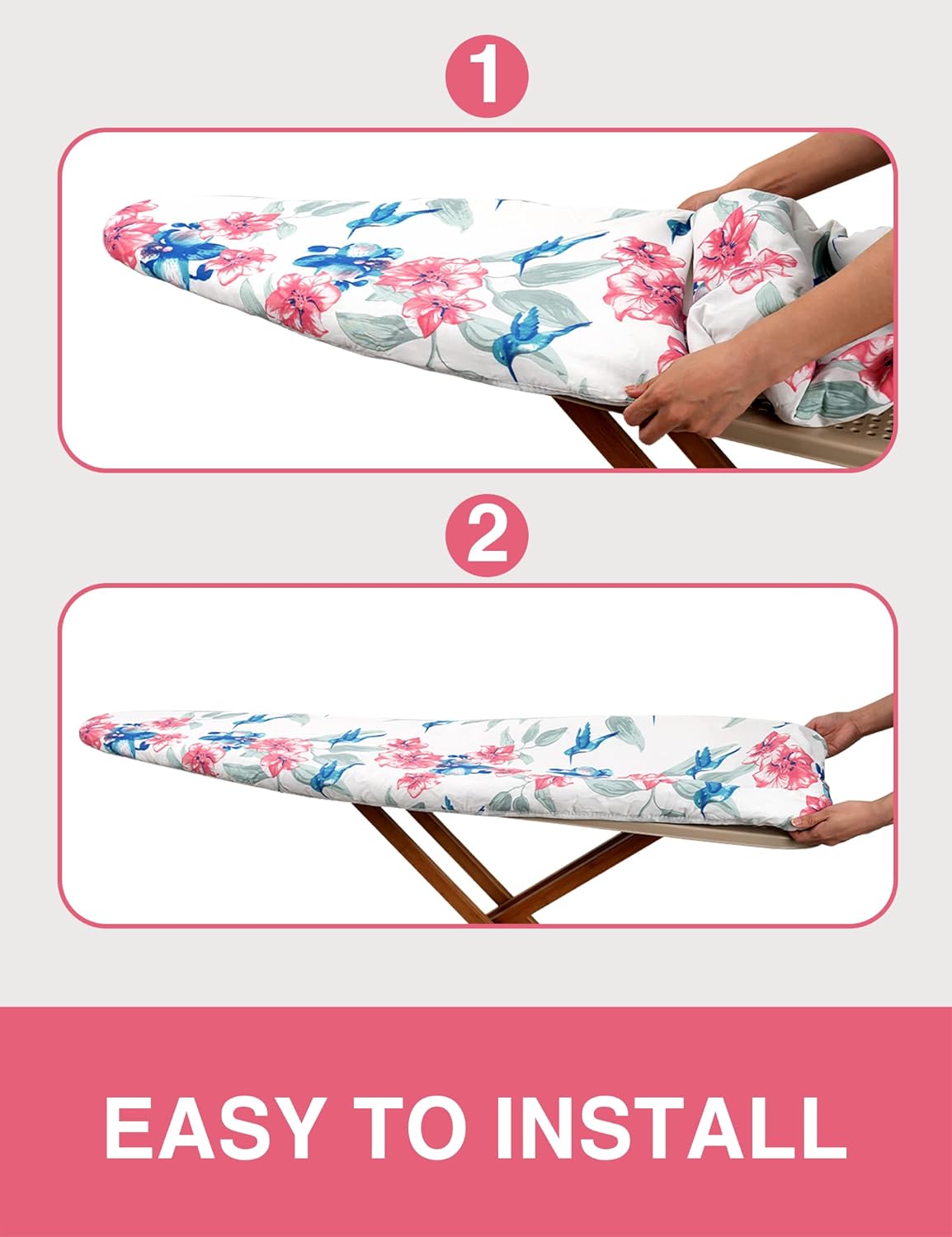 - STANDARD SIZE AND EASY TO INSTALL: Durable and stretchable material makes board cover fit standard size, and even 15" x 54" ironing boards. Cozy nose pocket helps installing easier, and fixing on the boards better