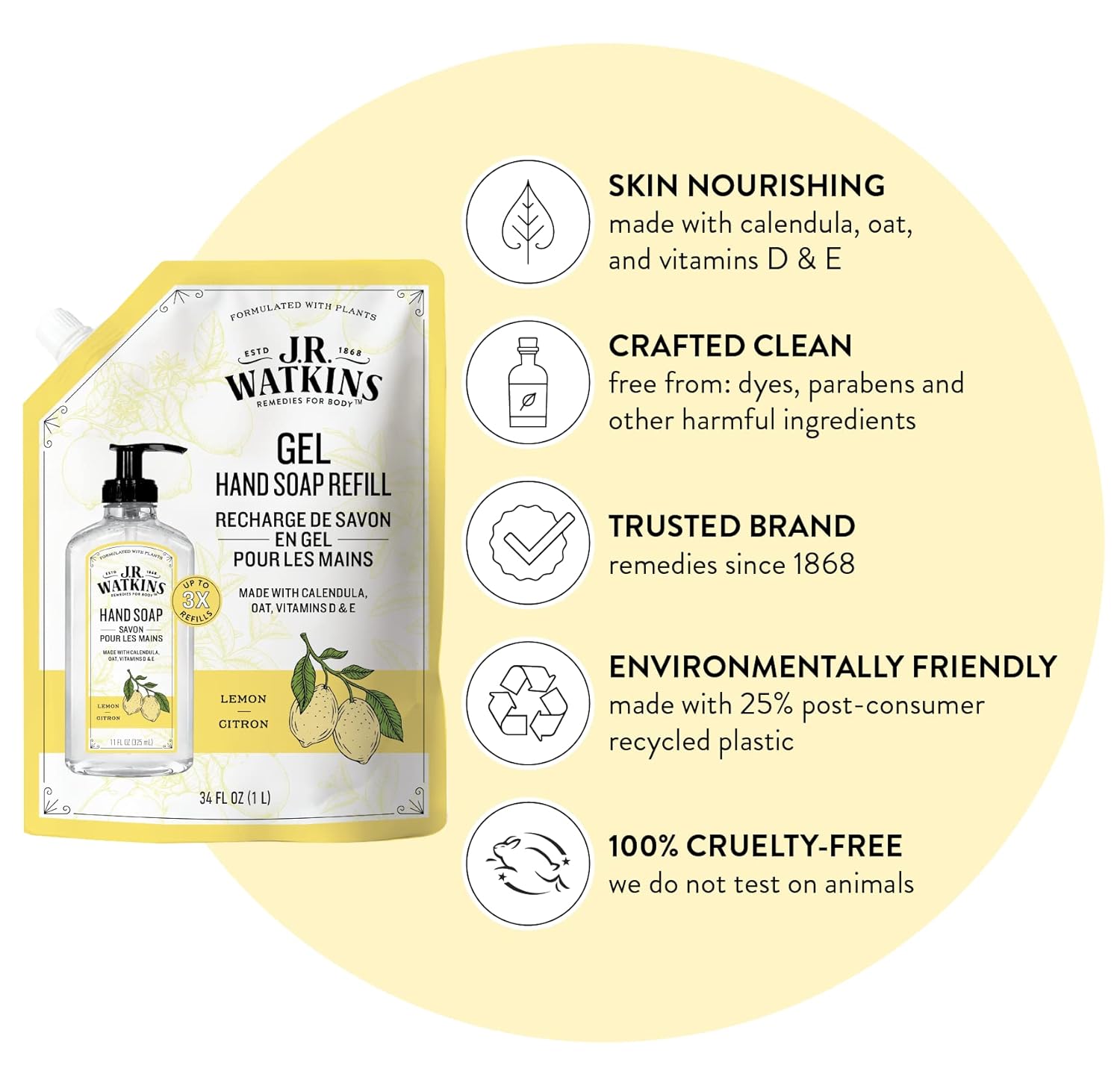 J.R. Watkins Gel Hand Soap Refill Pouch, Scented Liquid Hand Wash for Bathroom or Kitchen, USA Made and Cruelty Free, 34 fl oz, Lemon, 2 Pack