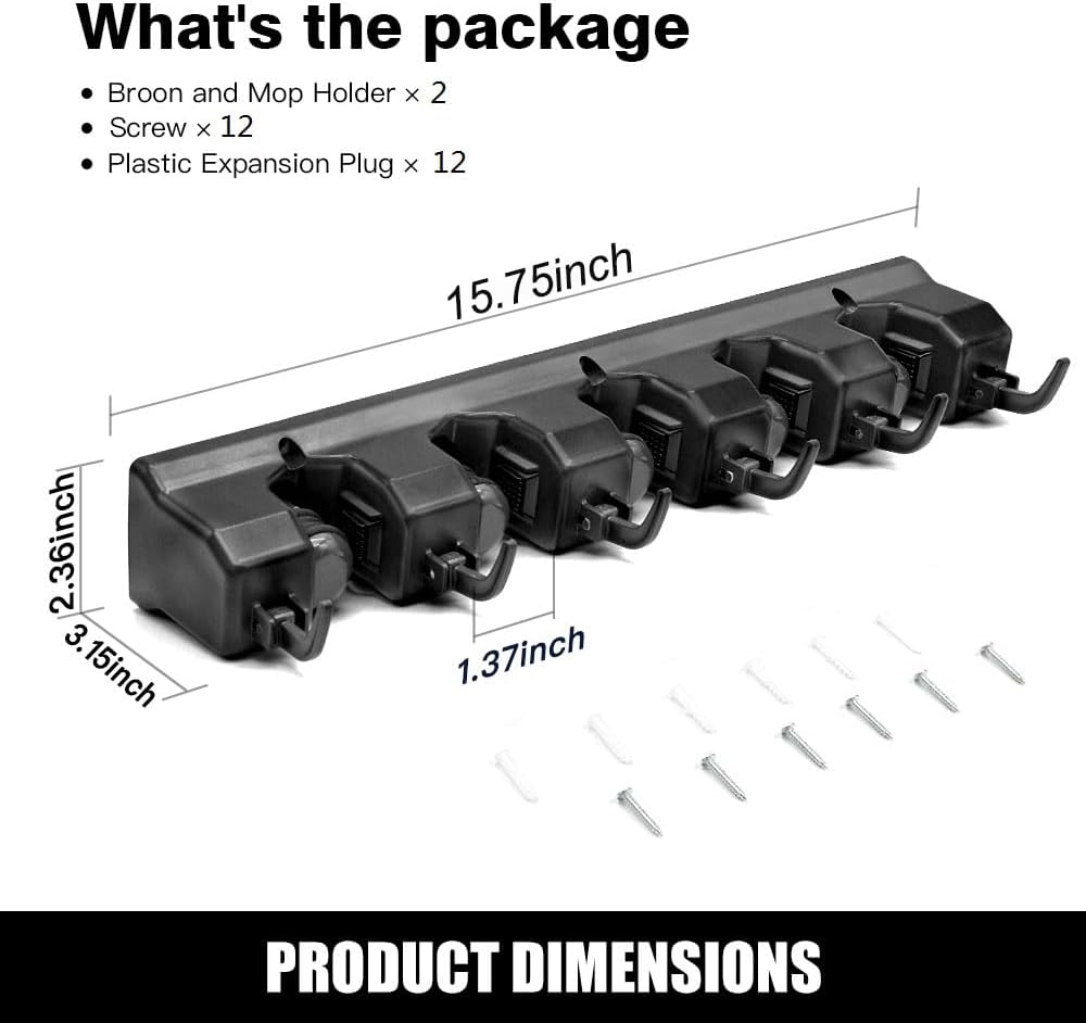 - Spring Loaded: Special spring clips design with rolling rubber ball that make sure the broom and mop will not fall out,including wet mop, dirty rakes, stick vacuum and other heavy stuff