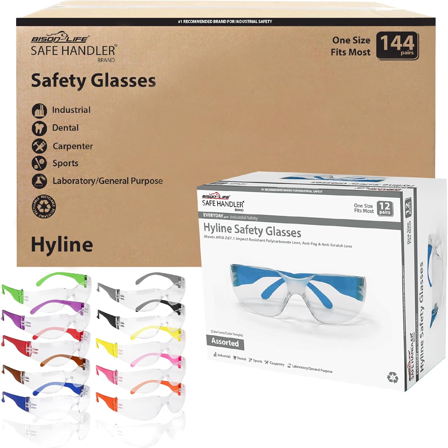 - SAFE HANDLER by Bison Life - Hyline Safety Glasses, Clear Lens Color Temple, 12 Boxes of 12 assorted colors each. Each box consist one color of: pink, red, orange, yellow, purple, green, black, turquoise, grey, blue, brown, clear