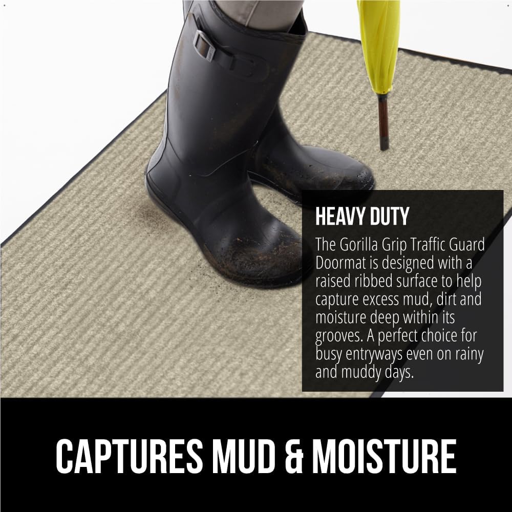 - BUILT TOUGH FOR HIGH TRAFFIC: the Gorilla Grip Traffic Guard doormat is ultra strong and built tough to withstand high foot traffic; constructed with a high quality textured PVC backing and raised fabric topside to help scrape off dirt and debris; thick and plush topside is gentle on bare feet, but durable for boots