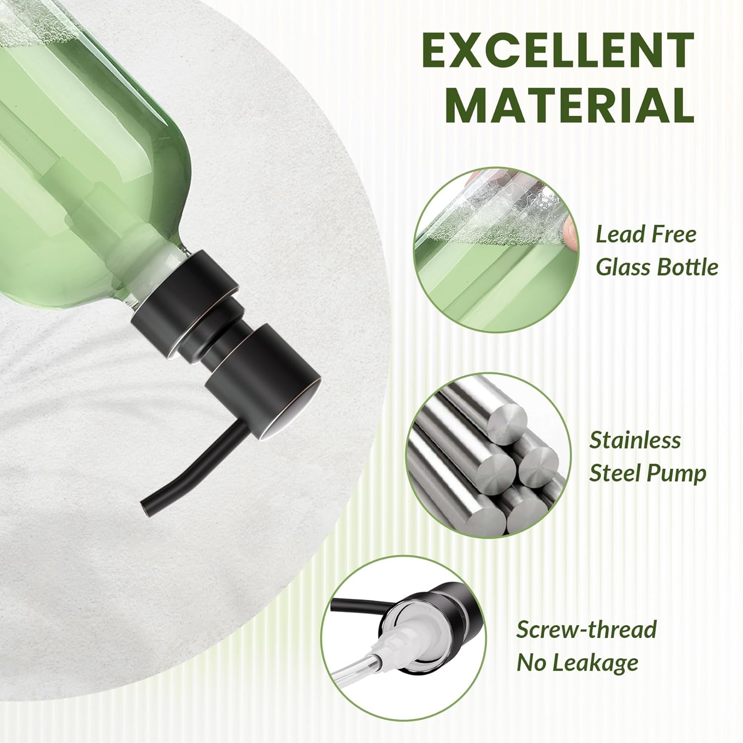 - Premium bottle material: Set of 2 thick clear glass dispensers are made of lead-free glass & pump, which can be safely used as dish soap dispenser for kitchen sink or lotion hand soap container for bathroom.