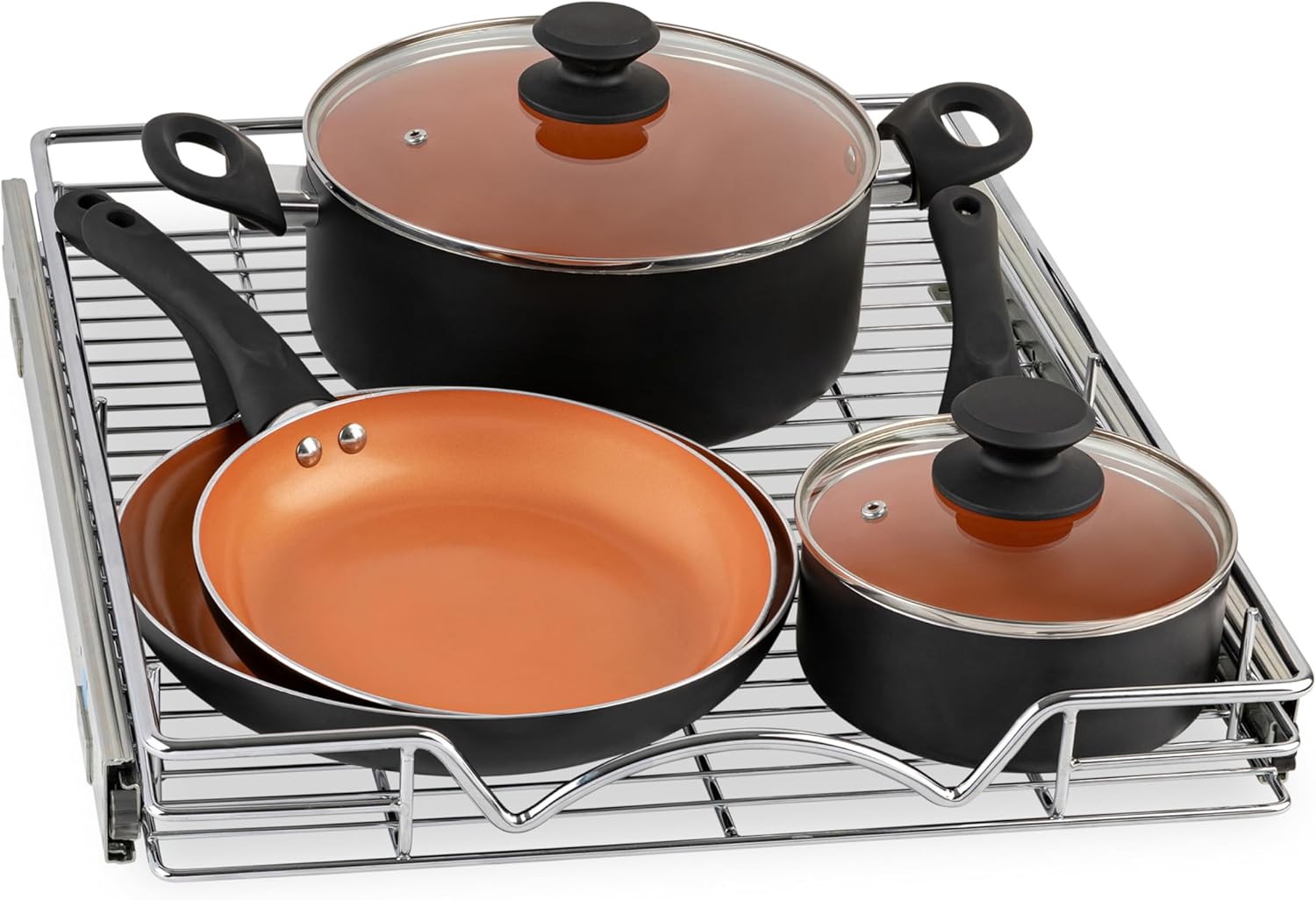 - HIGH QUALITY: Made of durable metal with chrome finish the pull out shelf for kitchen cabinet is simple and easy to install. Designed to fit any style of cabinetry and easy to clean.