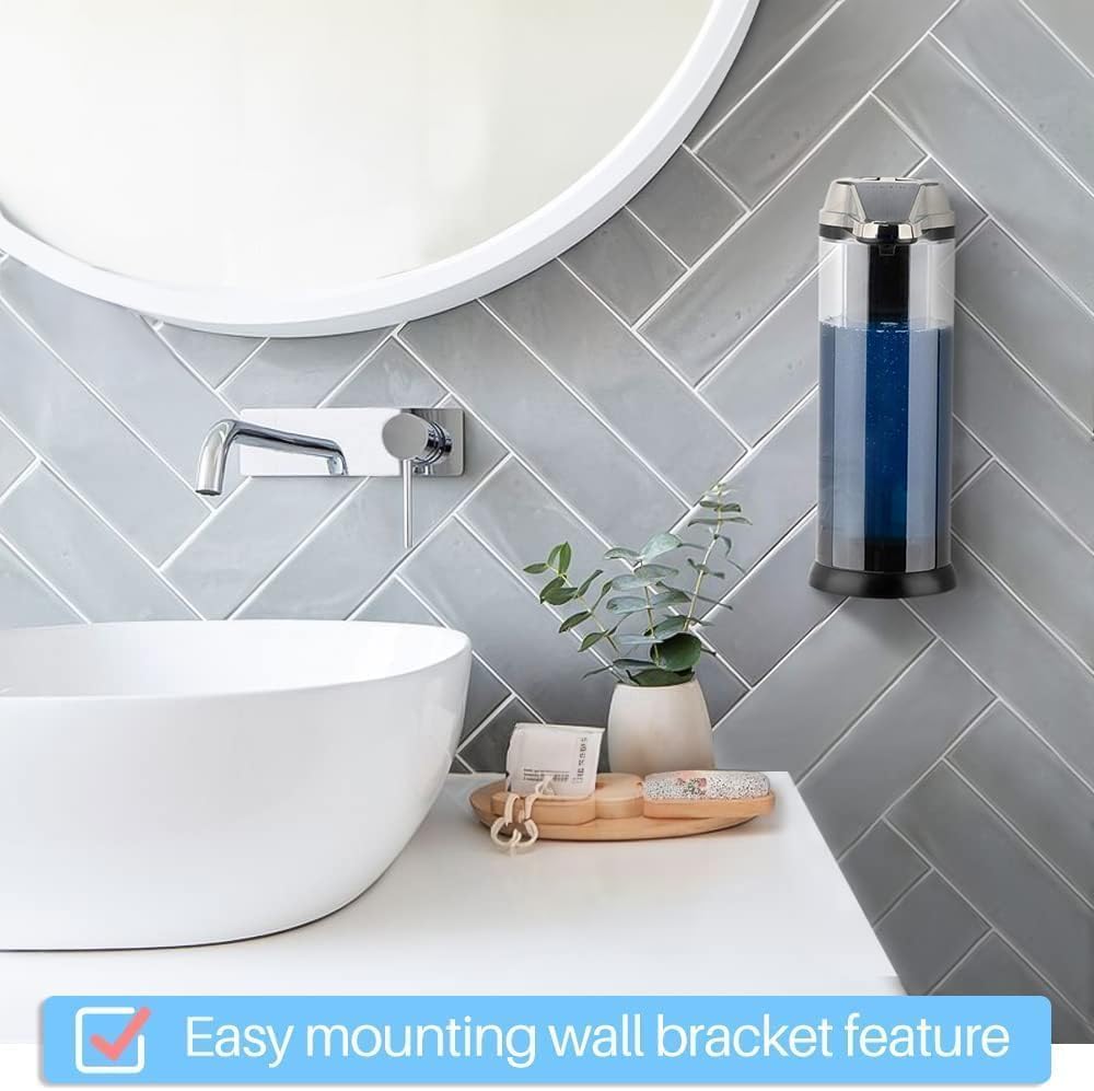 - Attractive and Stylish High Quality brushed nickel and black finish with clear soap container can be wall mounted or placed on a countertop