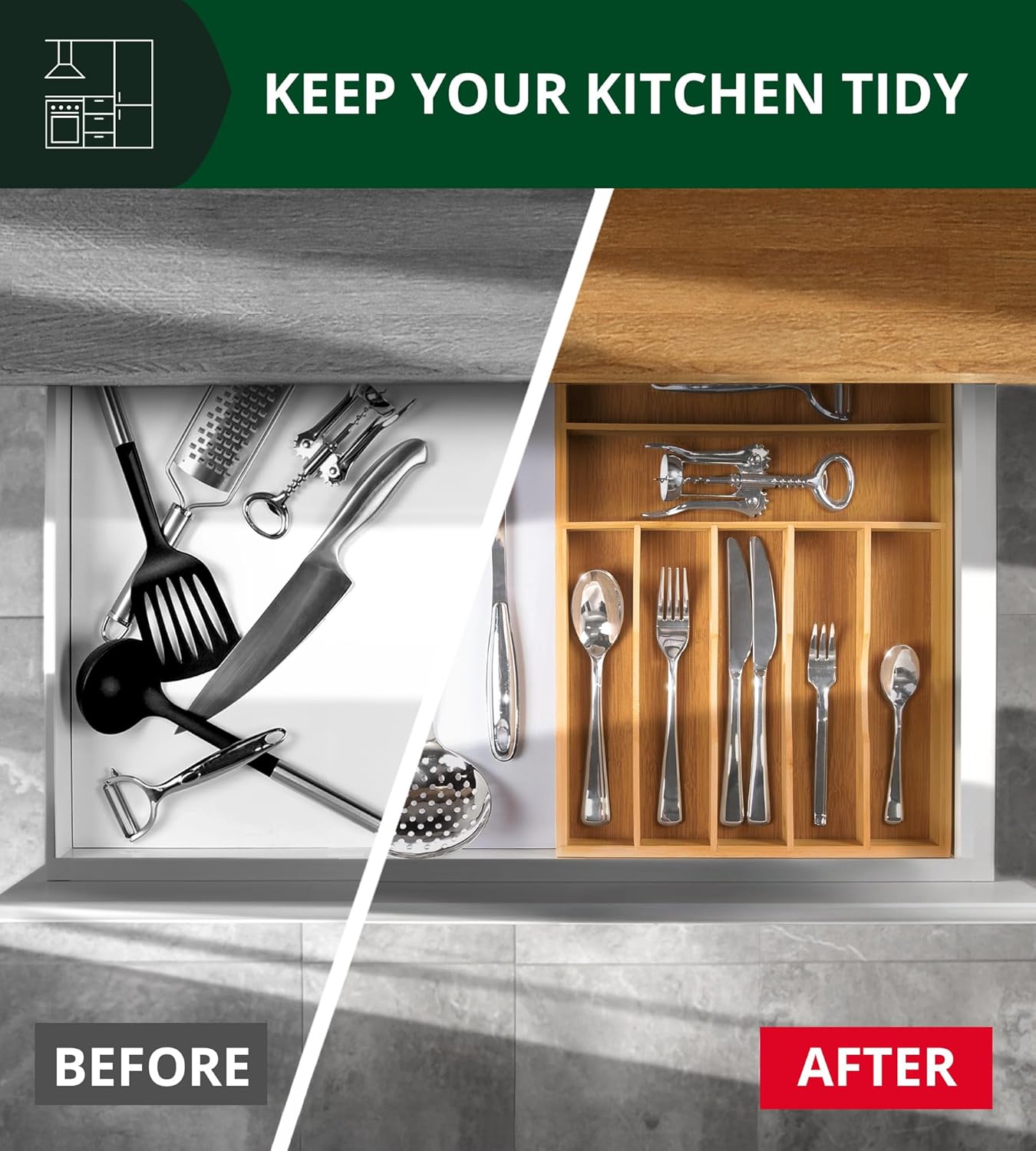 - ππππππ ππππππ πππππππ ππππ: This bamboo drawer organizer is exactly what youβve needed to help get your kitchen in tip-top shape. It may become easy to fall into the habit of tossing small items into the nearest drawer, creating the dreaded junk drawer or kitchen utensil drawer with piles of mixed tools. Measuring 16.3"x12.3", with 7 convenient 1.9" deep slots, conveniently organize and store your kitchen cutlery and rearrange flatware for a tidy, clean look