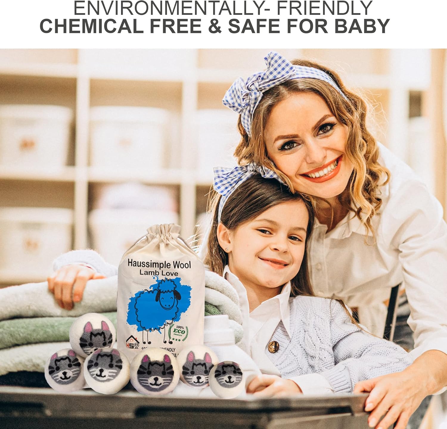 Wool Dryer Balls Organic Felt 6 Pack Laundry Fabric Softener, Extra Large Reusable Handmade Natural Sheep Wool Lint Wrinkle Free Anti Static Baby Safe (Cat)
