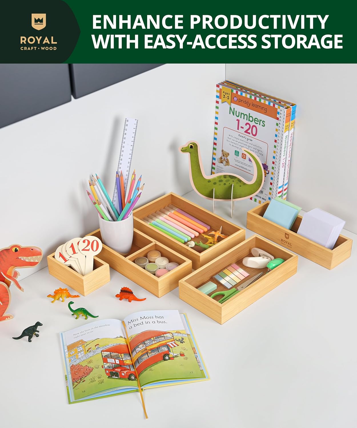 ROYAL CRAFT WOOD 5-Piece Bamboo Drawer Organizer Set – Multi-Use Storage Trays for Kitchen, Bathroom, Office, Makeup, Jewelry & More – Junk Drawer Tray, Utensil Holder, Storage Box & Bin Set (5 Boxes)