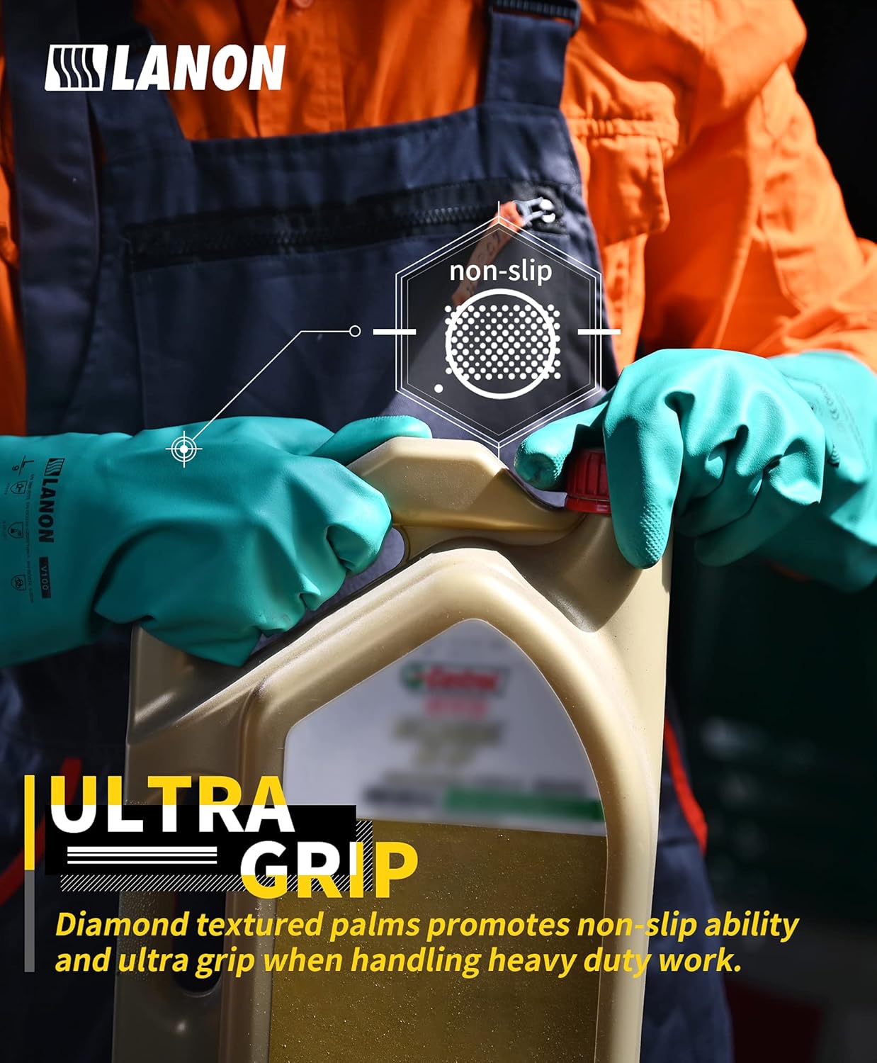 LANON 3 Pairs Nitrile Chemical Resistant Gloves, Reusable Heavy-Duty Rubber Gloves, Acid, Alkali & Oil Protection, Non-Slip, XL