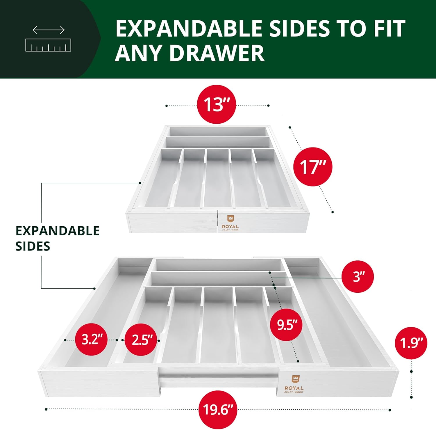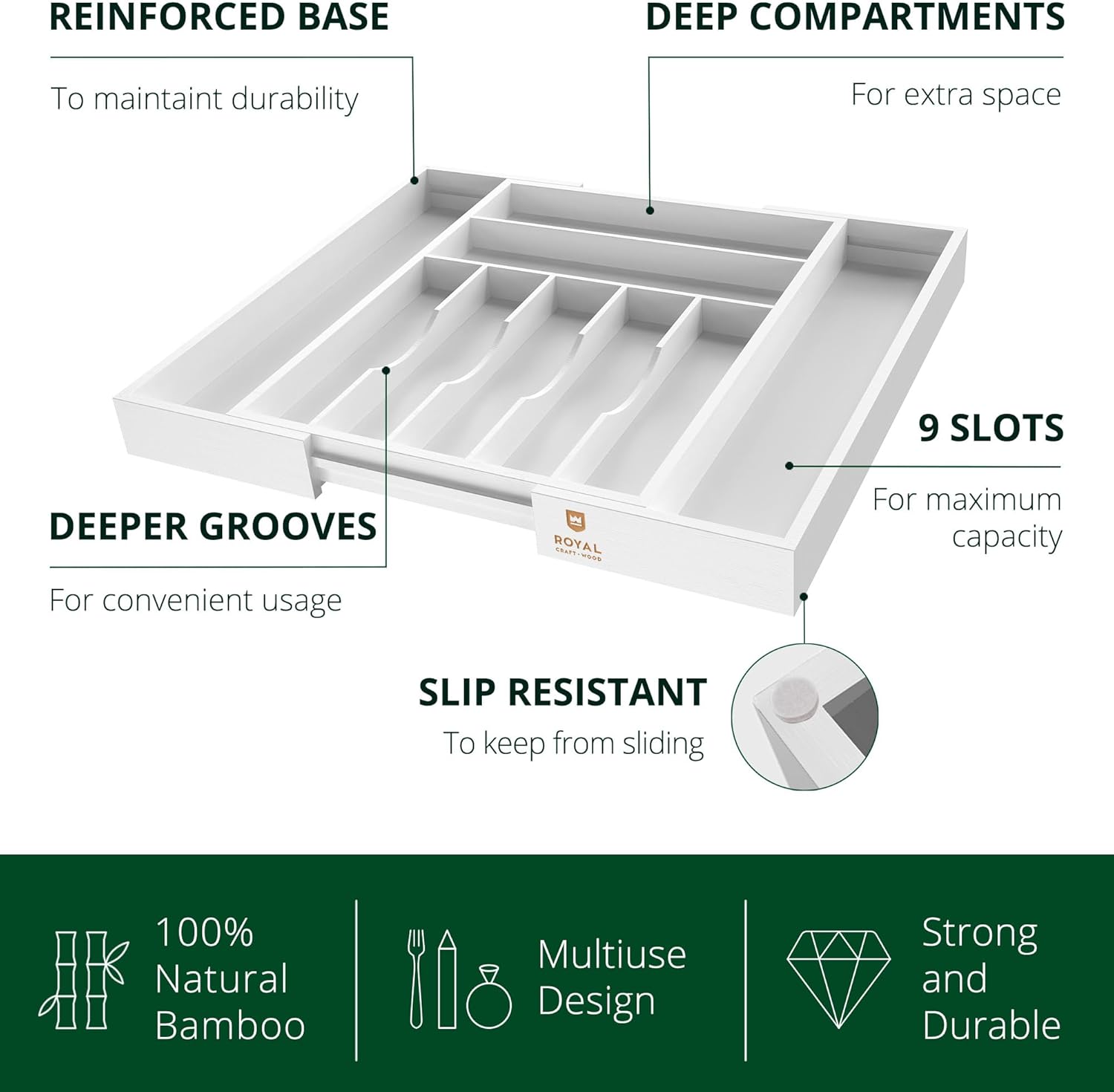 ROYAL CRAFT WOOD Luxury Bamboo Kitchen Drawer Organizer - Silverware Organizer - Utensil Holder and Cutlery Tray with Grooved Drawer Dividers for Flatware and Kitchen Utensils (9 Slot, White)