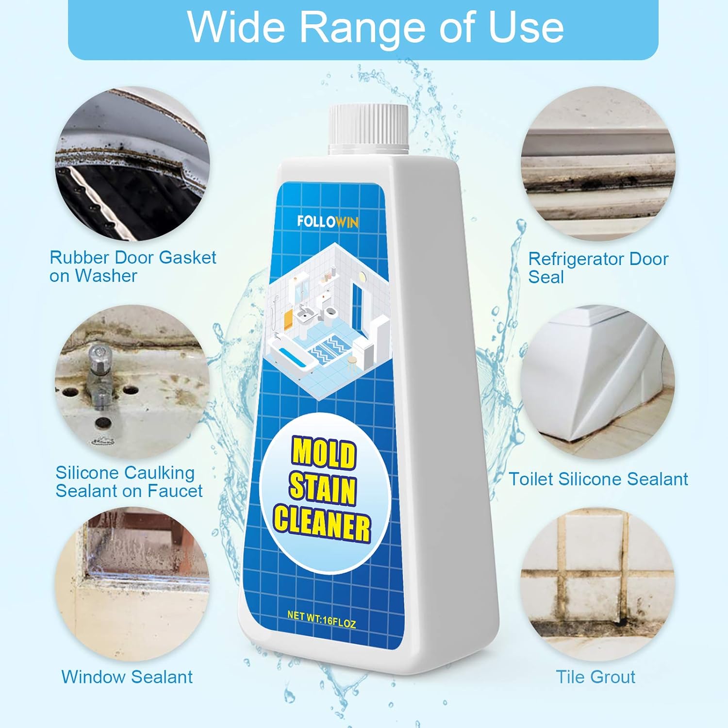 FOLLOWIN Mold and Mildew Stains Cleaner Gel 16oz for Washing Machine Front Loader Seal, Household Mold Stain Cleaner for Shower,Sink,Mold Stain Remover Gel for Bathroom Grout,Bathtub
