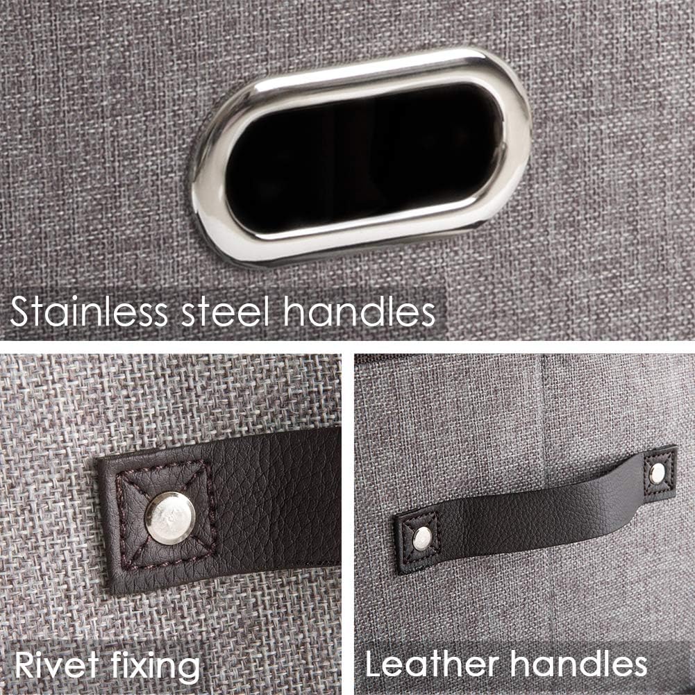 PRANDOM Larger Collapsible Storage Bins for Closet [3-pack] Decorative Linen Fabric Storage Baskets Cubes with Leather/Metal Handles for Living Room Cloth Grey and Black Trim (17.3x12.2x10.4 Inch)