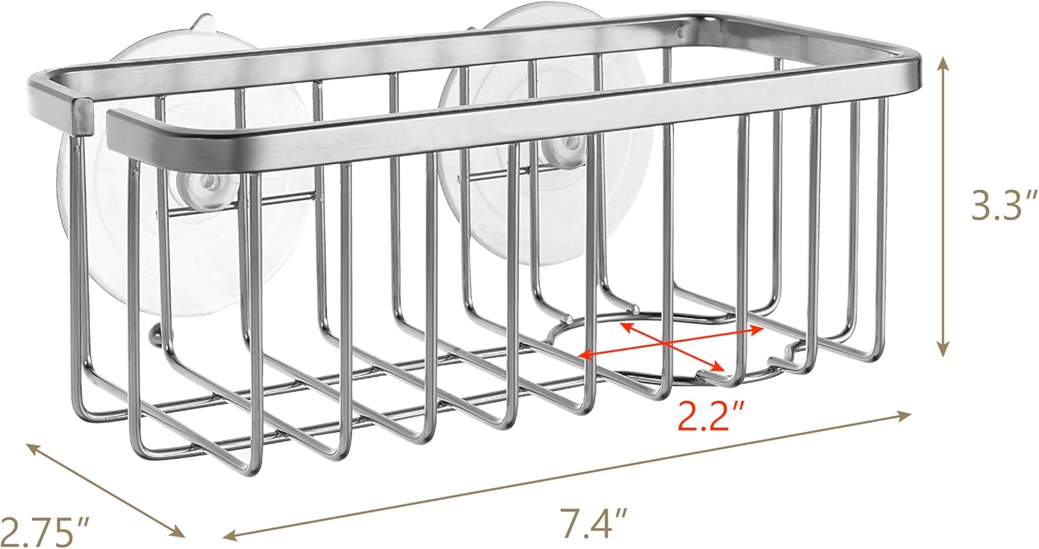 - Spacious Yet Compact Design – Offers more storage than standard sink caddies while maintaining a compact footprint. Holds multiple sponges, brushes, scouring pads, and drain stoppers with ease. Overall dimensions: 7.48" x 3.3" x 2.75". Important: This model is slightly larger than standard caddies—please confirm your sink depth can accommodate 3.3" height. The brush slot opening is approx. 2.2" x 2.2". Use a measuring tool (not visual estimation) to ensure your brush head fits.