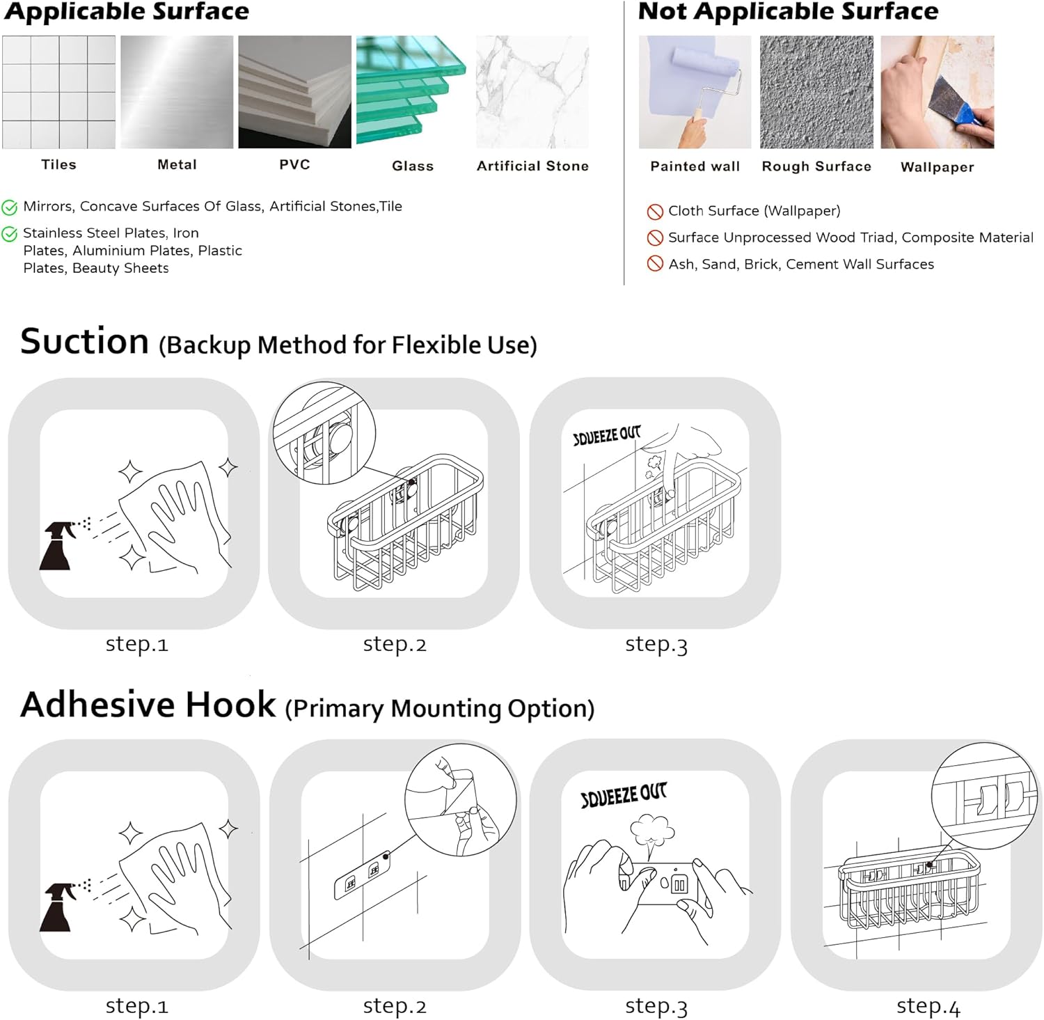 - Important Compatibility Notice: Suction cups are only effective on smooth, non-porous surfaces such as polished tile, stainless steel, or glass. Does NOT stick well to stone, cement, granite, Silgranit, marble, or textured surfaces. Use included adhesive pad for those surfaces.