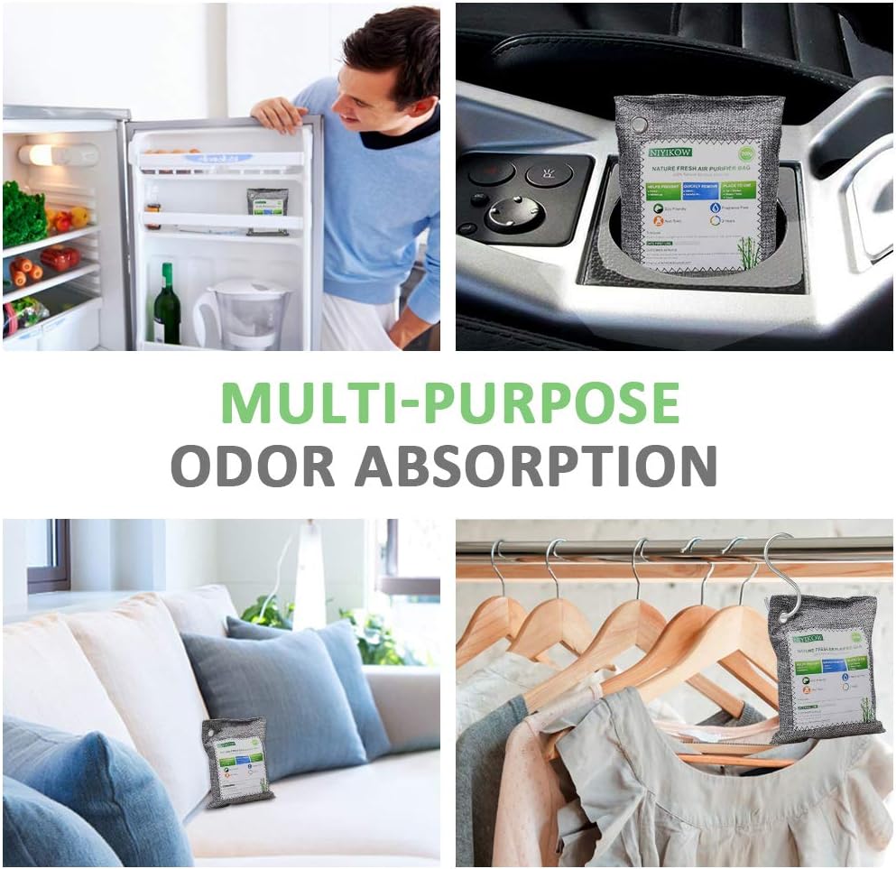 - All-Natual Ingredient Odor Absorbe - Our charcoal air purifying bags use the highest quality bamboo charcoal from Southeast Asia โ with NO harmful additives. 10 times better than regular charcoal as each natural air purifier bag contains activated charcoal from sustainable bamboo processed with high temperature oxygen-free carbonization. These bamboo bags are the best choice for clean air and odor removal.