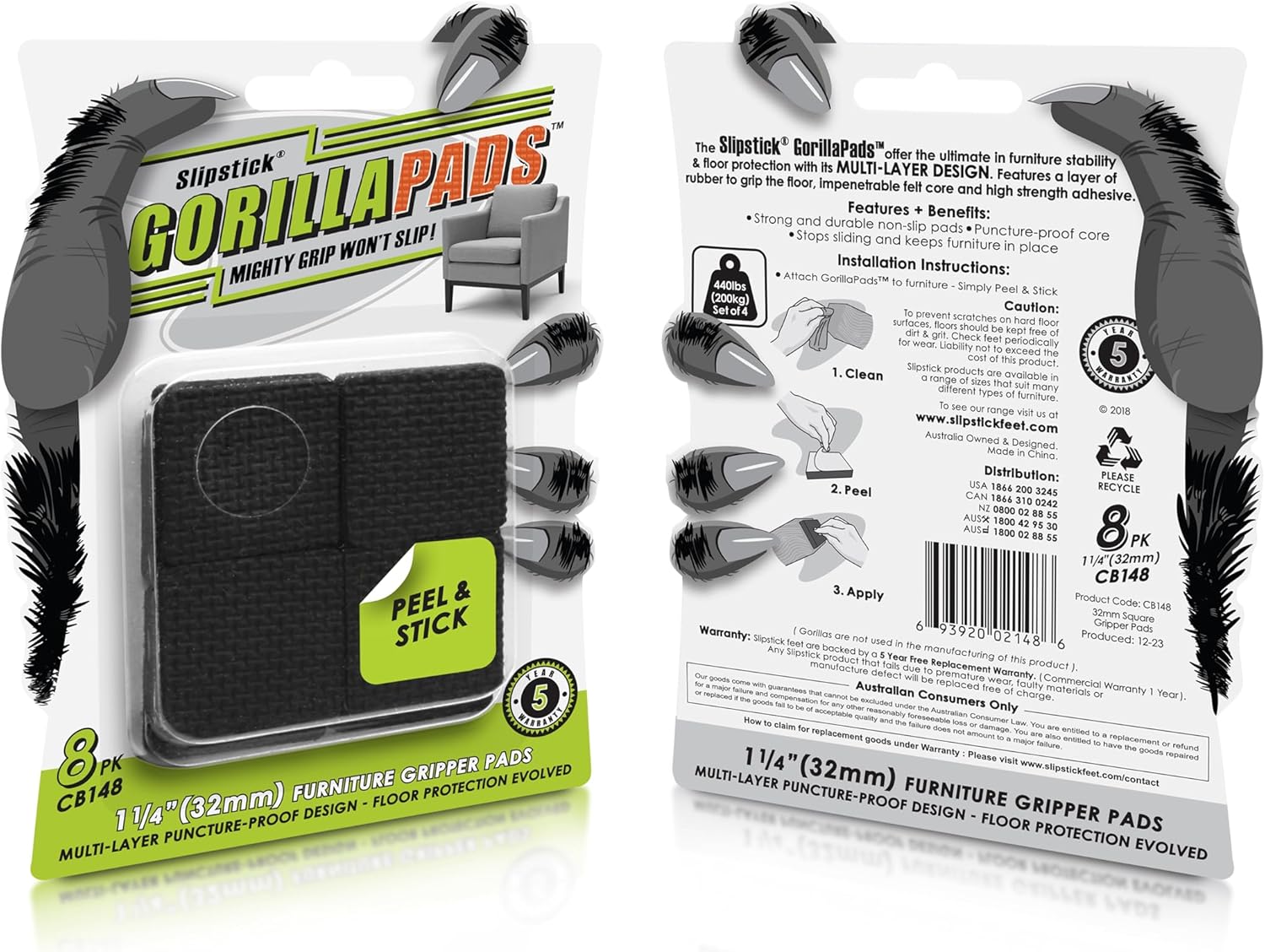 - Mighty grip that wont slip β Gorillapad furniture grippers by Slipstick are the universal solution to stop unwanted movement or sliding of furniture / objects and effectively protect hard surfaces from scratches or damage. Premium adhesive non slip furniture pads.