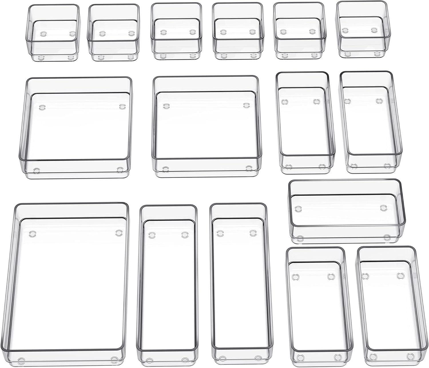 SMARTAKE 16-Piece Drawer Organizer with Non-Slip Silicone Pads, 5-Size Desk Storage Tray for Makeup, Jewelries, Utensils in Bedroom Dresser, Office and Kitchen, Clear