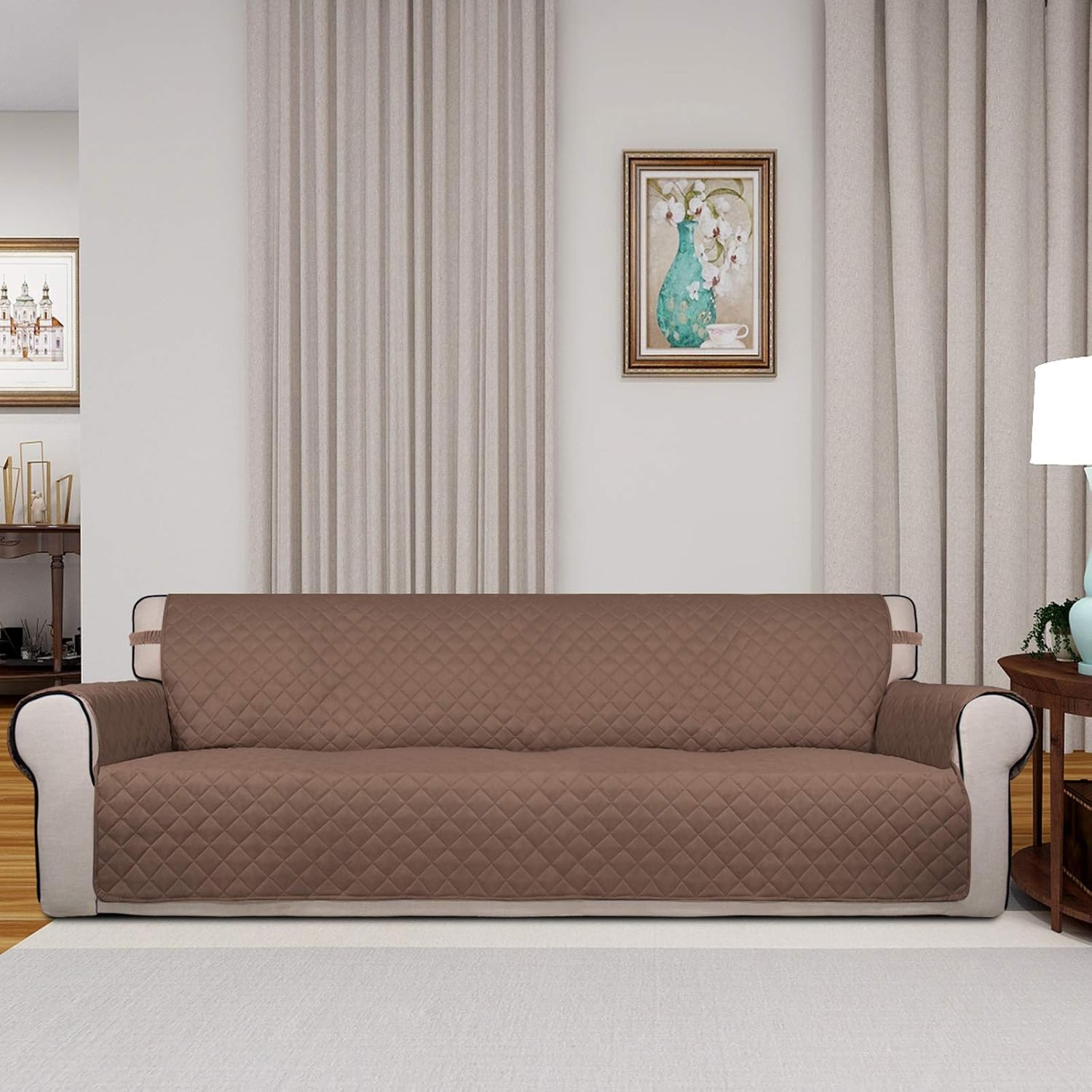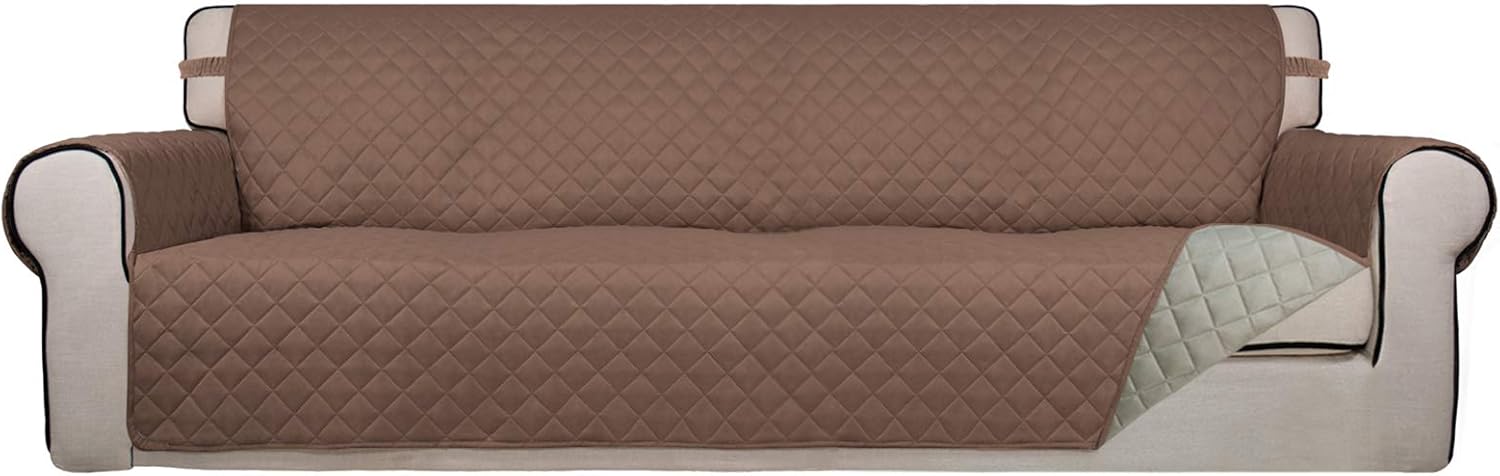 PureFit Reversible Quilted Sofa Cover, Water Resistant Slipcover Furniture Protector, Washable Couch Cover with Non Slip and Elastic Straps for Kids, Dogs, Pets (XX Large, Brown/Beige)