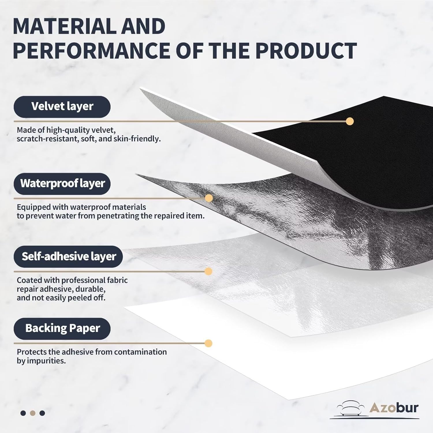 - Material and Performance: The upholstery repair tape features high-quality velvet on the front, which is scratch-resistant, soft, and skin-friendly. It has a waterproof layer in the middle to prevent water from penetrating into the repaired items. The back is coated with professional fabric repair adhesive, typically durable for at least two years. The adhesive comes with a backing paper to protect it from debris. This upholstery tape is odorless and 100% environmentally friendly.