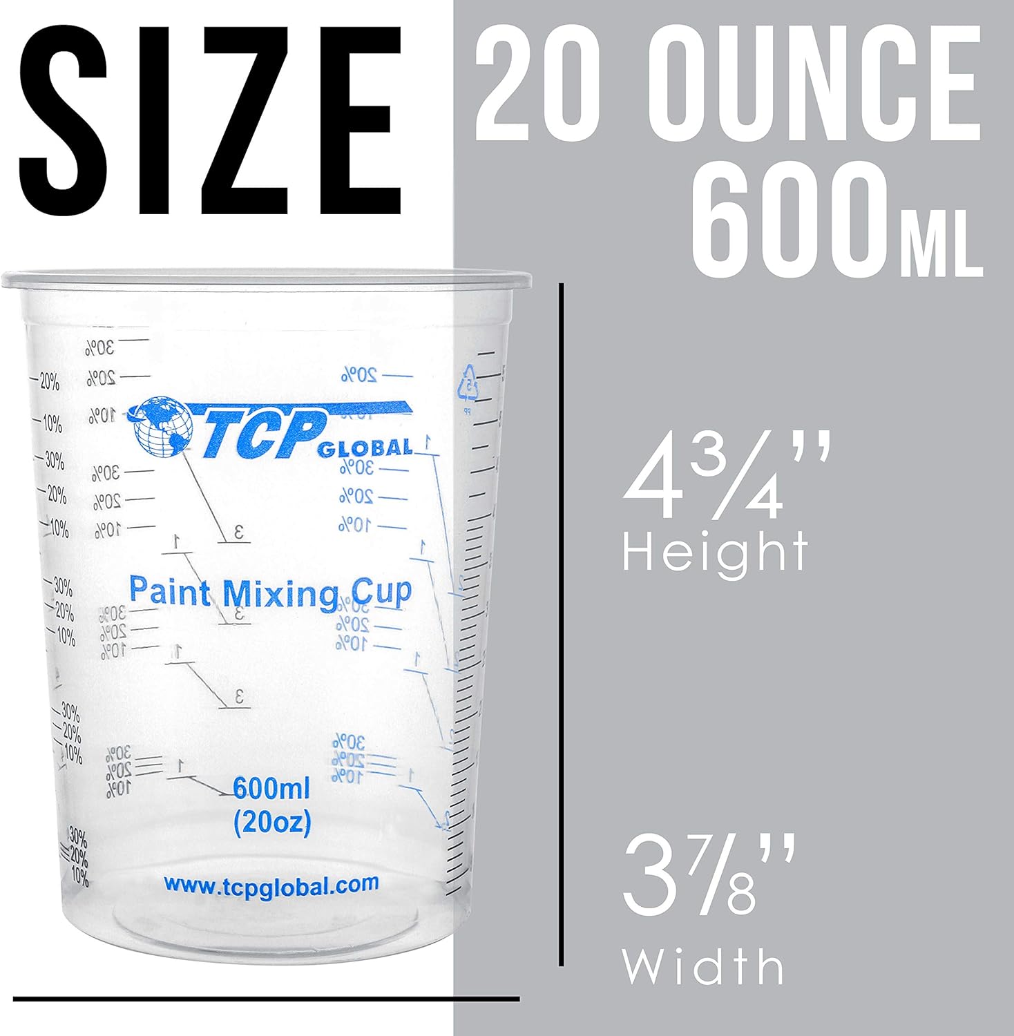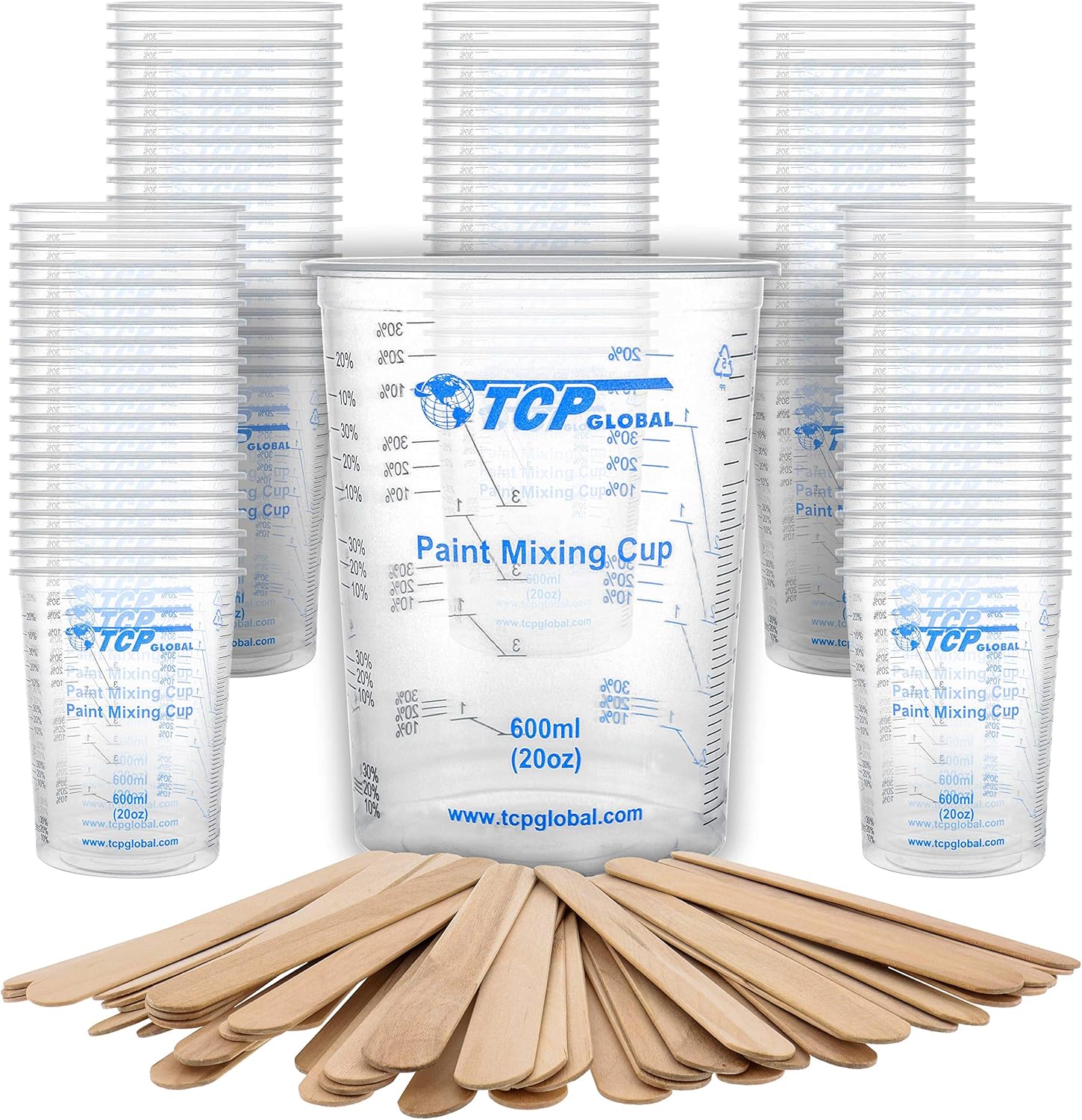 TCP Global 20 oz. (600ml) Graduated Plastic Mixing Cups - Box of 100 with 50 Mixing Sticks - Disposable Plastic Measuring Cups for Liquids, Paints, Resin, Epoxy, Art, Kitchen - Ratios 2-1, 3-1, 4-1 ML
