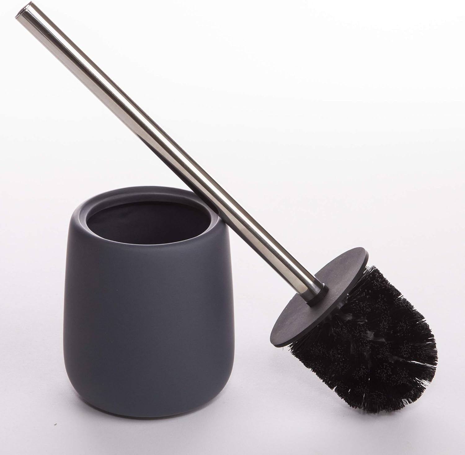- DURABLE & DISCREET: Sturdy-bristled brush deep cleans hard to reach places for a sparkling bathroom; The brush sits in its own holder when it's not in use for discreet storage; If closet or cabinet space is limited, the holder keeps the brush head out of view; The handle fits nicely in the hand and the round disc shields hands from splashes