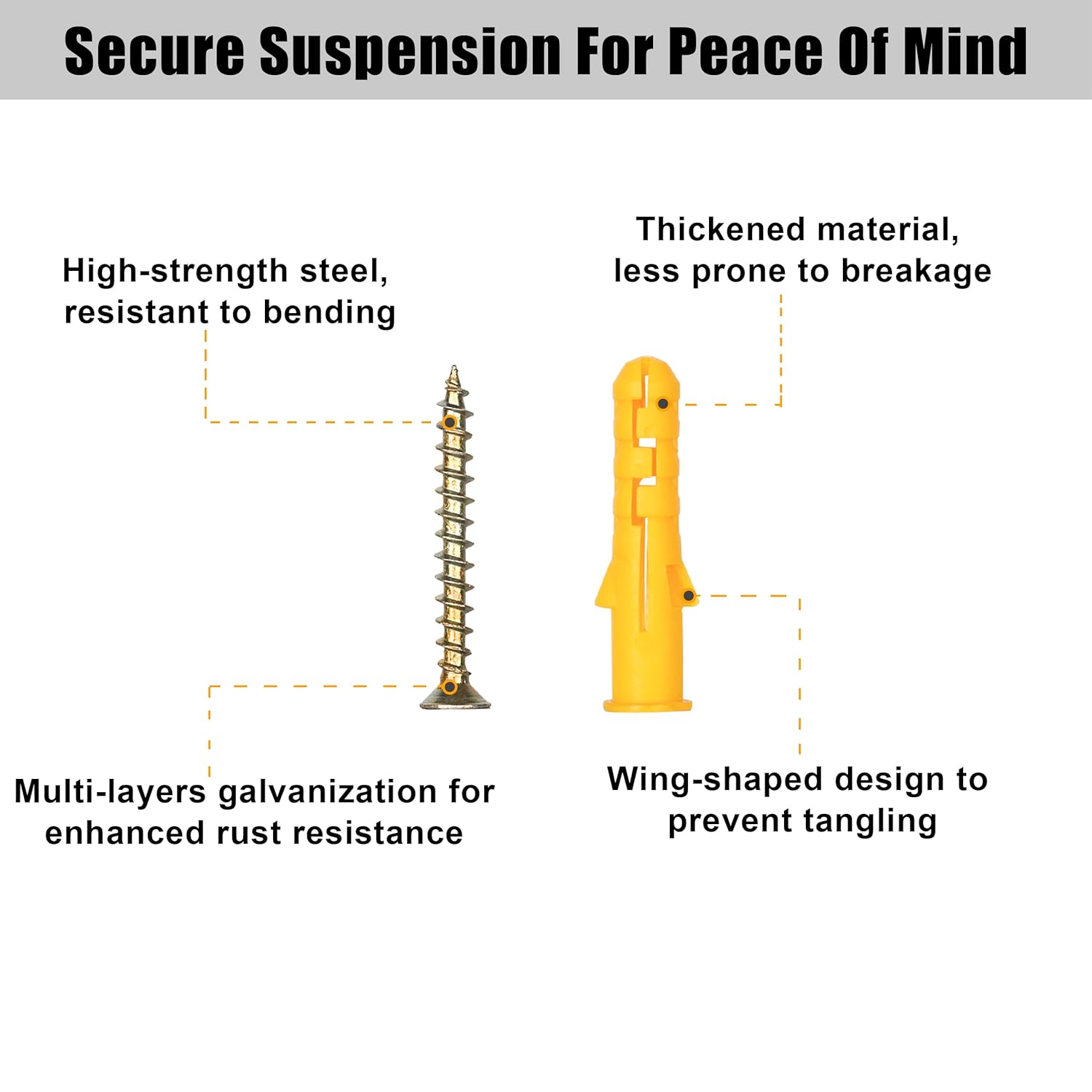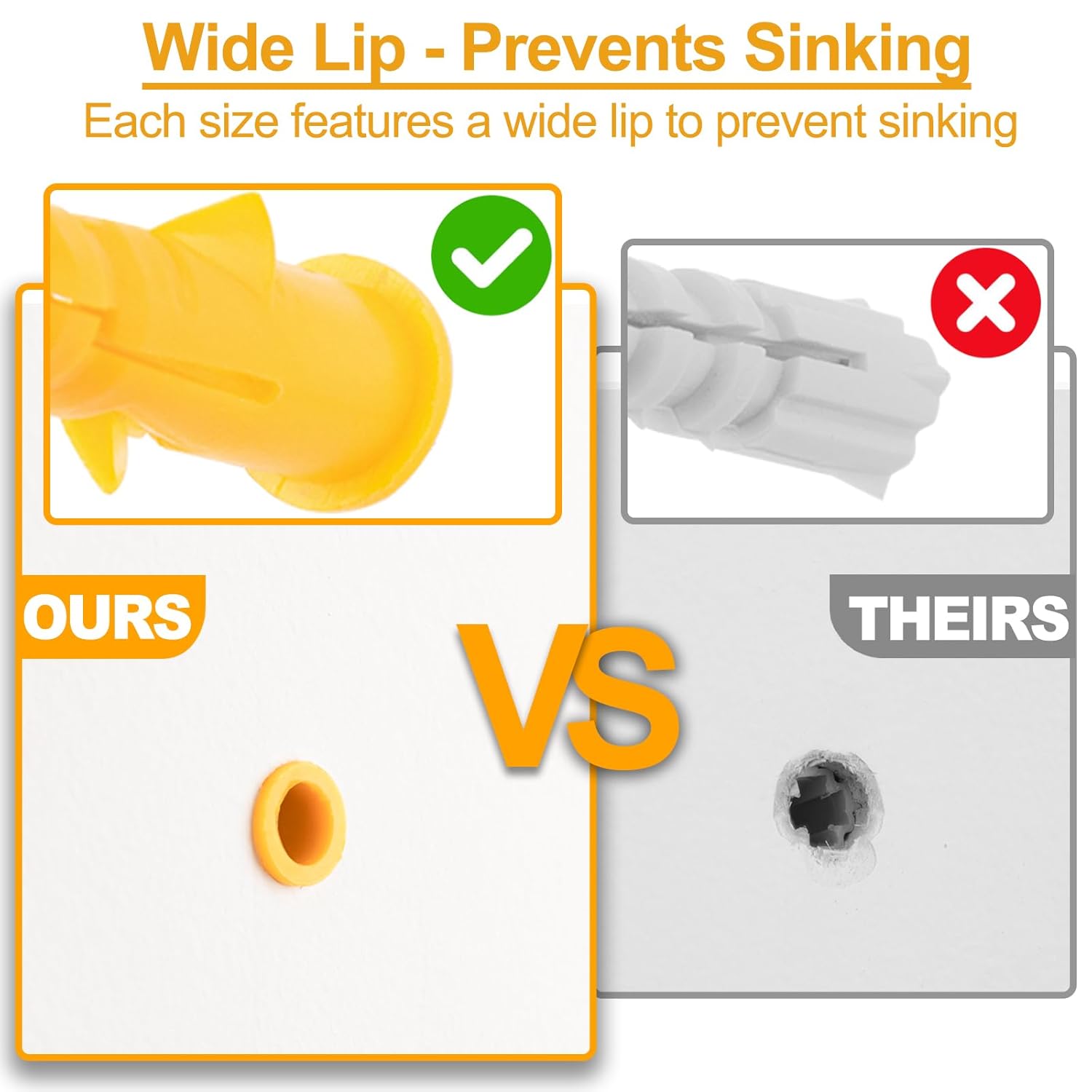 - PREMIUM MATERIALS FOR SUPERIOR DURABILITY: Our plastic wall anchors are crafted from a high-performance nylon and PE compound, providing enhanced strength, wear resistance, and long-lasting reliability. The ribbed design ensures a tight grip inside the wall, preventing slipping or loosening over time. The galvanized Phillips screws made of high-carbon steel offer outstanding hardness and resistance to rust and corrosion, making them ideal for both indoor and outdoor applications.