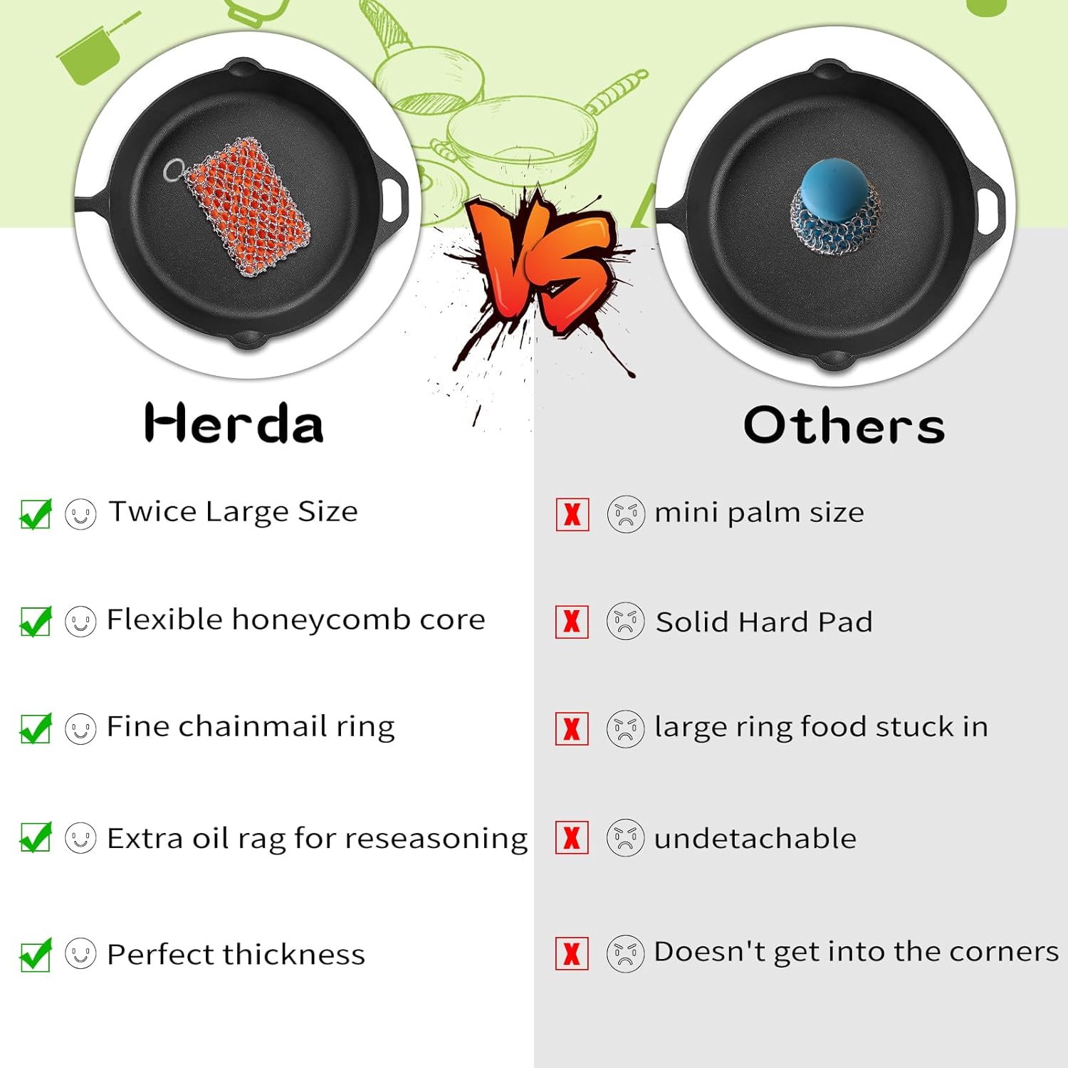 - 【Large Size Cast iron scrubber】TWICE LARGER than mashroom style chain mail scrubber help improve the cast iron cleaning efficiency and save your time. Herda silicone chainmail scrubber Linked with 3mm small fine chainmail ring, Leave the dirt nowhere to hide.