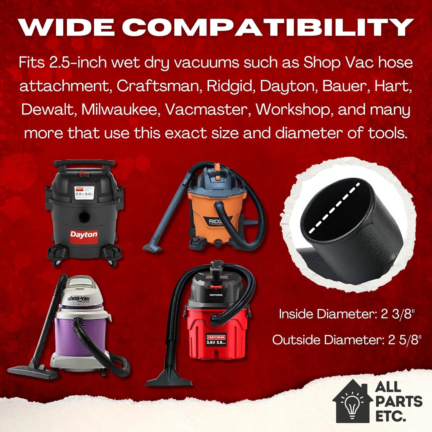 - COMPATIBLE - Fits 2.5-inch wet dry vacuums such as shop vac hose attachment, Craftsman, Ridgid, Dayton, Bauer, Hart, Dewalt, Milwaukee, Vacmaster, Workshop, and many more that use this exact size and diameter of tools.